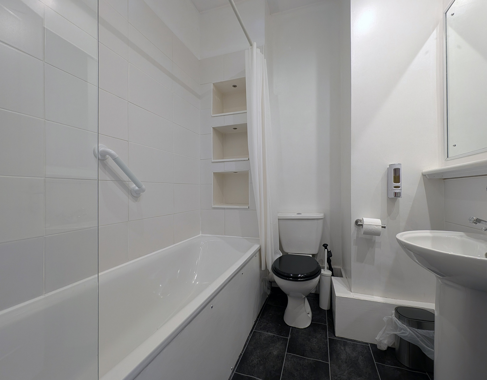 Bathroom: Modern bathroom with shower over bath, fresh towels, and toiletries provided
