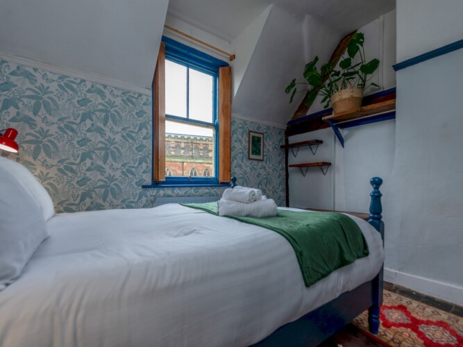 Living Space: The kitchen and lounge are open plan and provide modern amenities whilst retaining the historic charm of the building. There is a dining table in the kitchen area for guests to enjoy a meal around or simply socialise. The lounge has a tv and a comfortable sofa, and a bean bag.