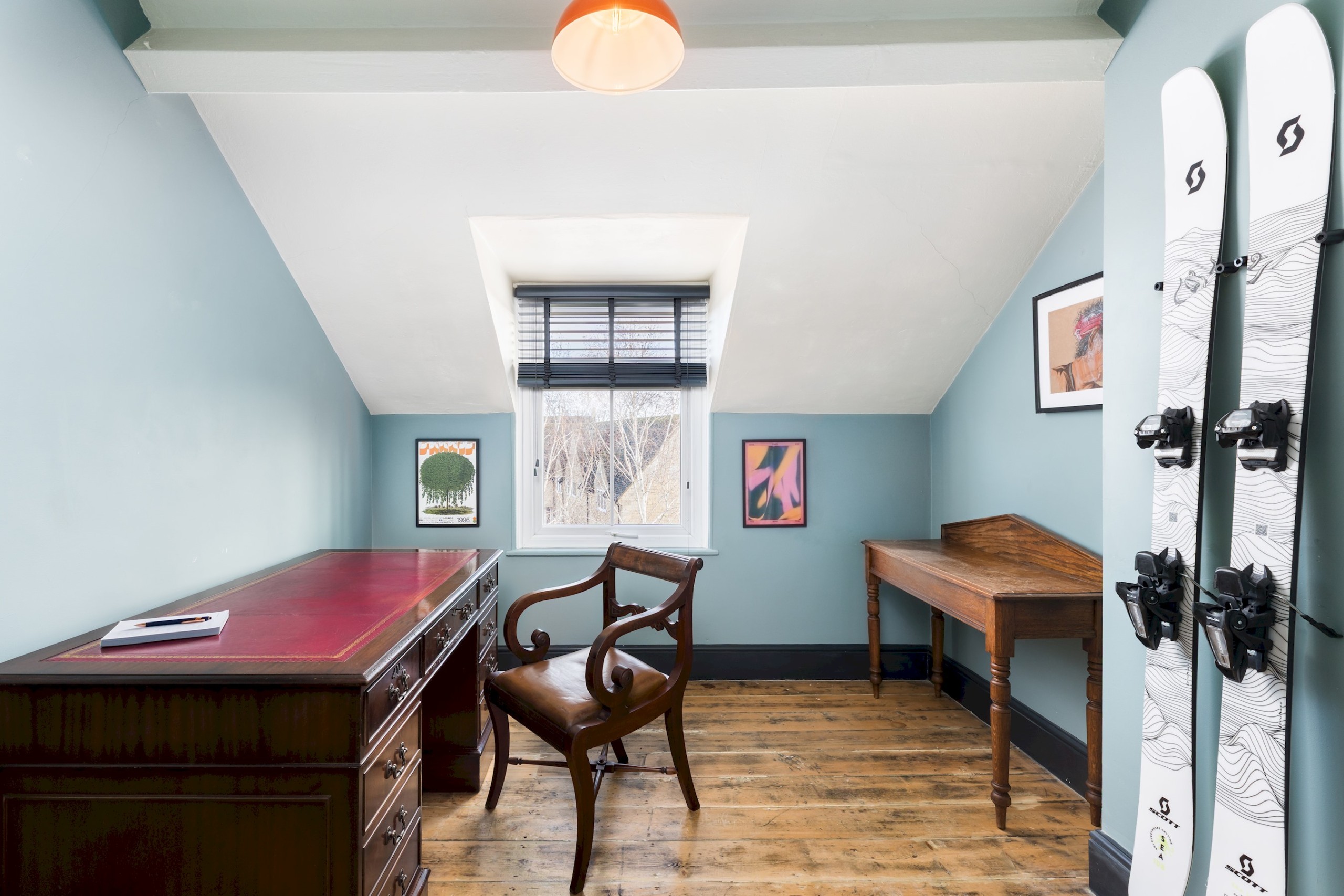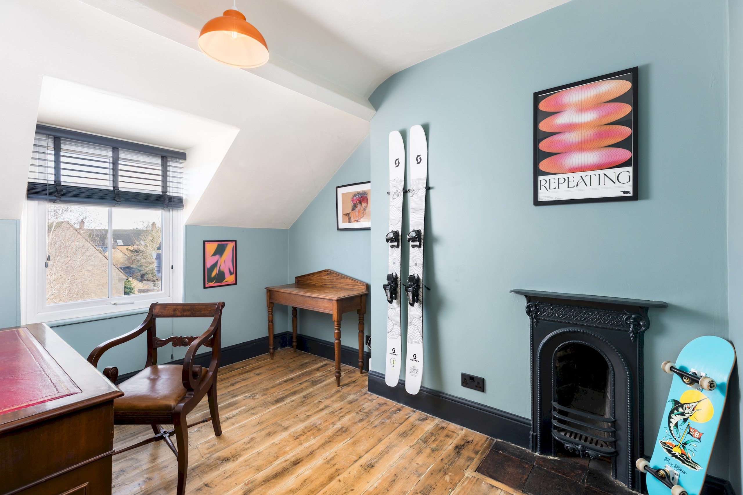 Ascending to the top floor, there is a spacious study with a grand desk and another large bedroom with a King-sized bed. The bedroom looks out over the beautiful Cotswold hills
