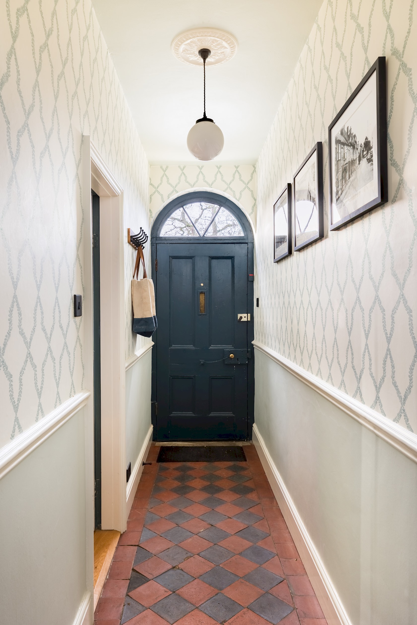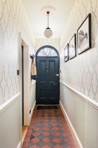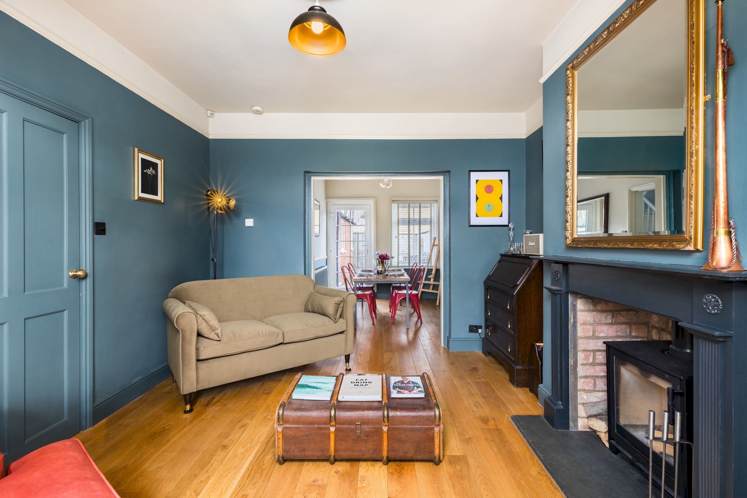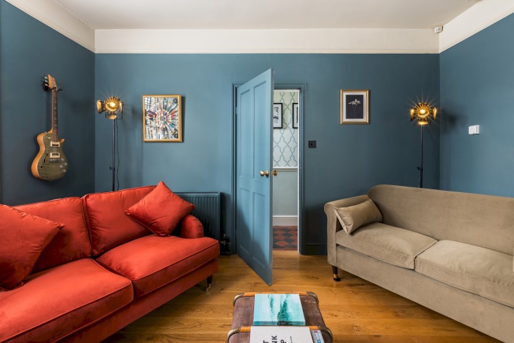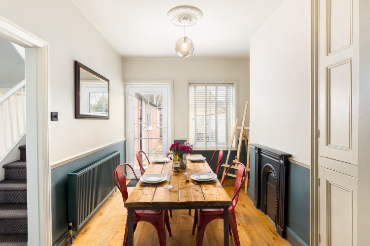 Guests are welcomed into a spacious Victorian hallway adorned with a beautifully maintained tiled floor. To the right, a contemporary living room awaits, thoughtfully furnished to compliment the home’s character. This cosy space features a log burner, inviting sofas, and a Smart TV.