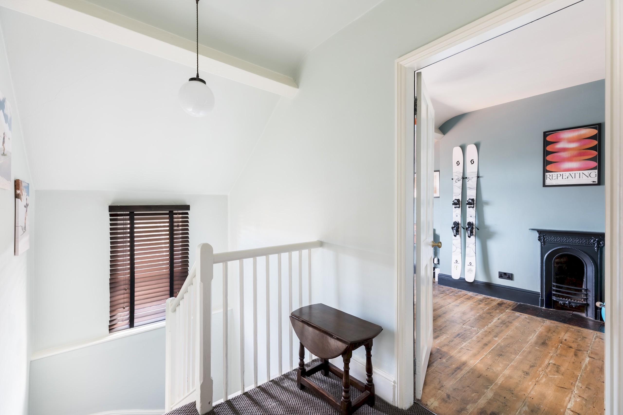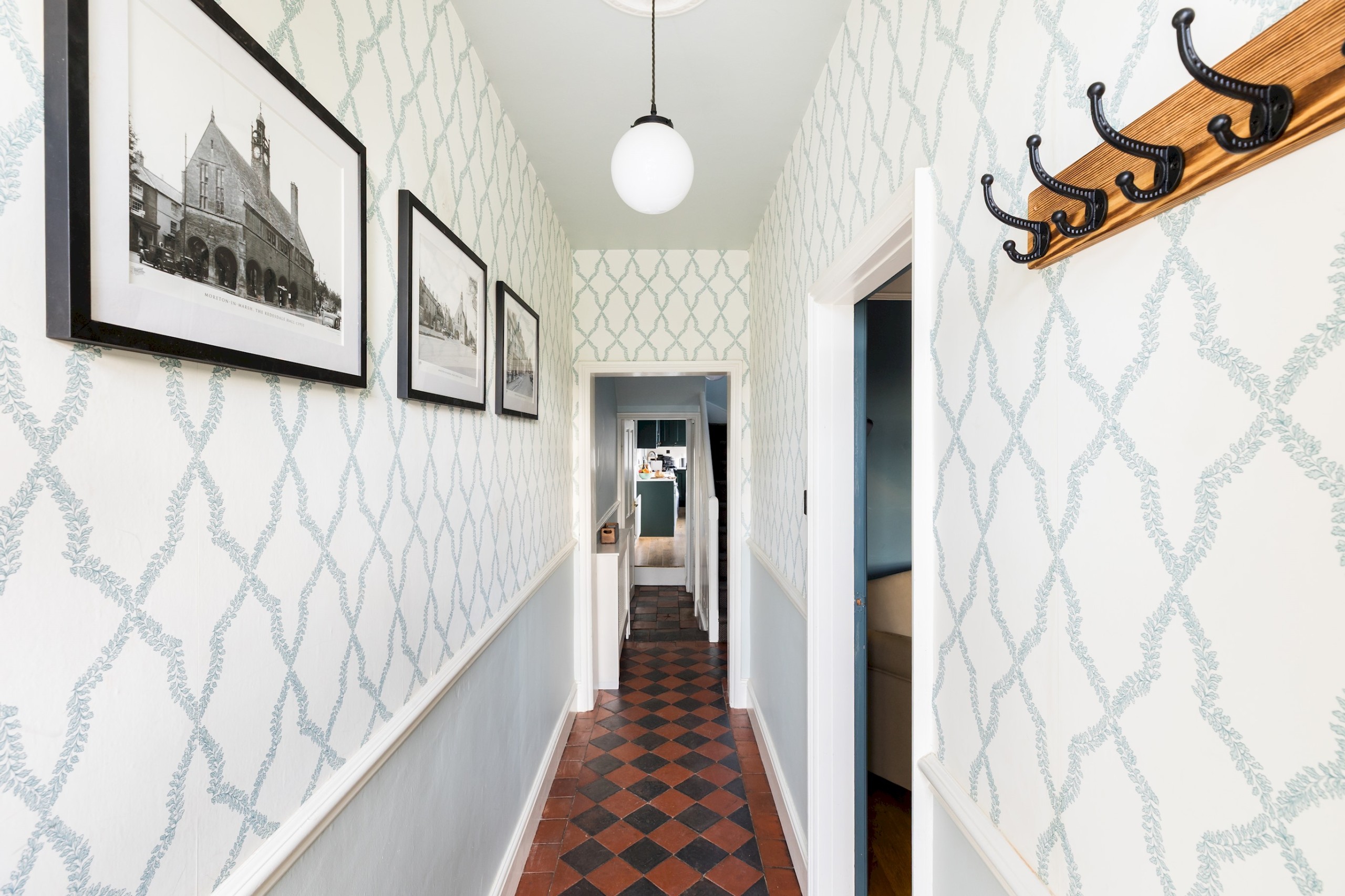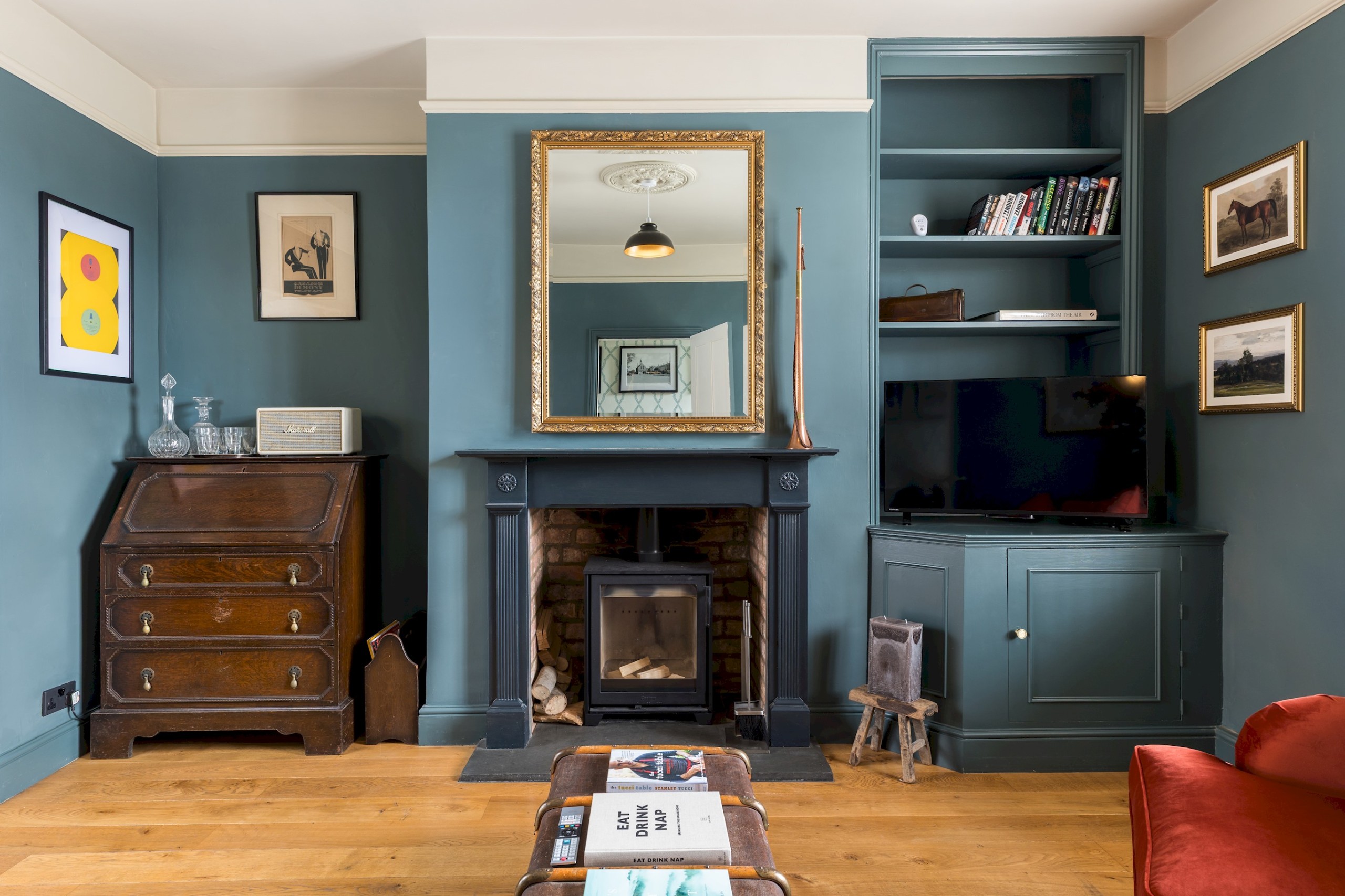 Guests are welcomed into a spacious Victorian hallway adorned with a beautifully maintained tiled floor. To the right, a contemporary living room awaits, thoughtfully furnished to compliment the home’s character. This cosy space features a log burner, inviting sofas, and a Smart TV.