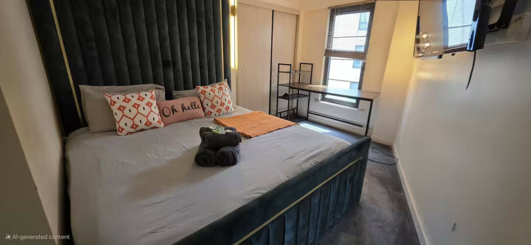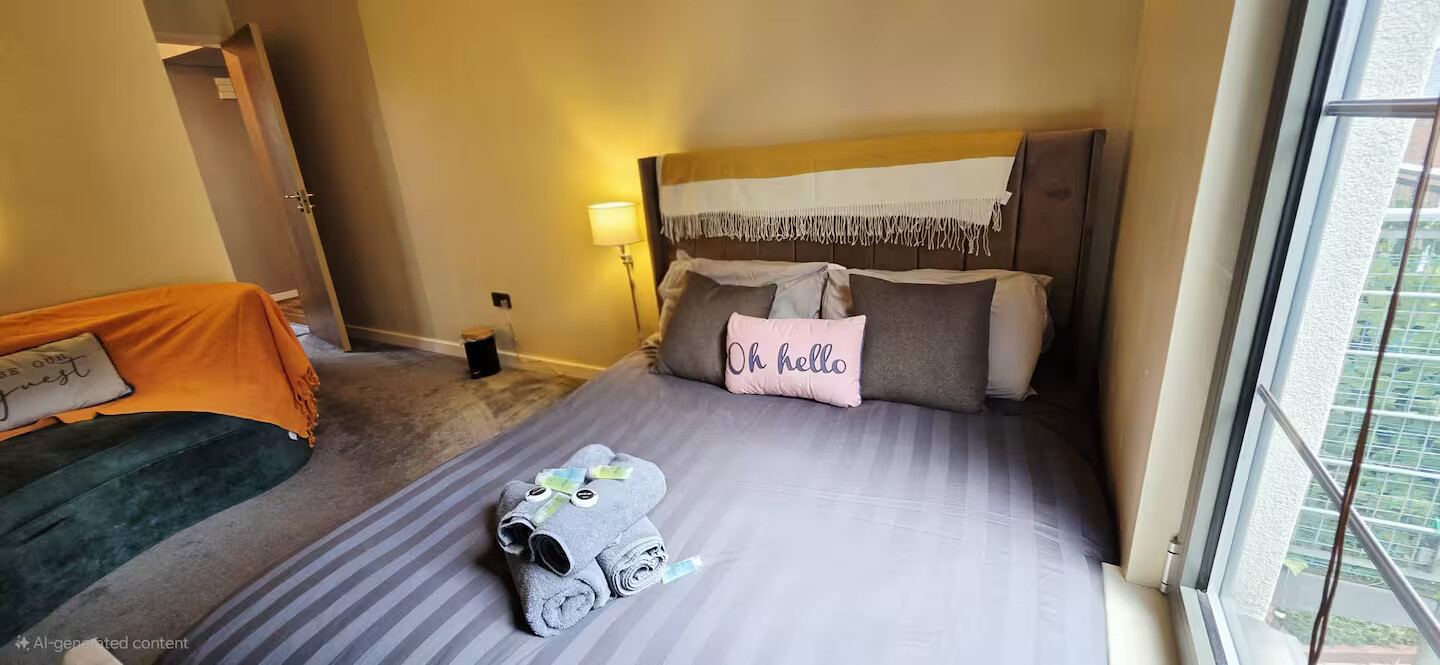 Experience comfort and style in this 2-bedroom, 2-bathroom apartment on the 5th floor offering stunning panoramic views of Nottingham. Enjoy your morning coffee on the private balcony, cook meals in the fully equipped kitchen, and relax in the cosy living area. Sleep soundly in comfy double beds and freshen up with hotel-quality towels. Free parking, shops, and top restaurants are just minutes away!