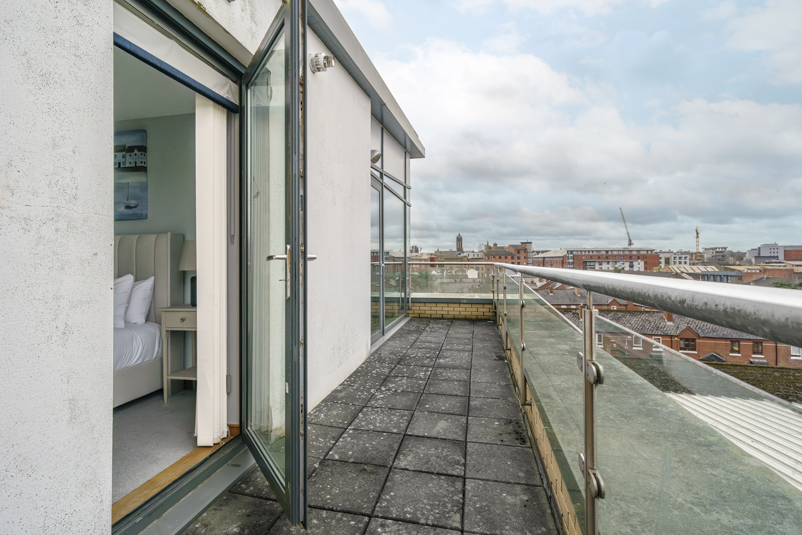 Sensational one-bedroom city centre penthouse apartment with cityscape and mountain views from huge balcony.