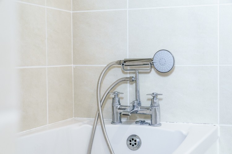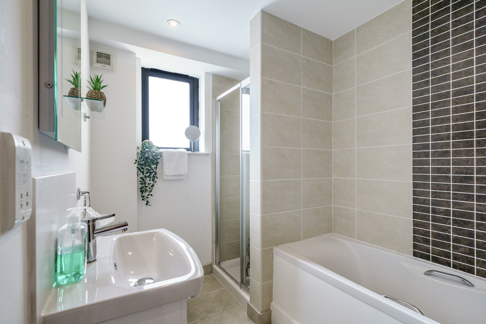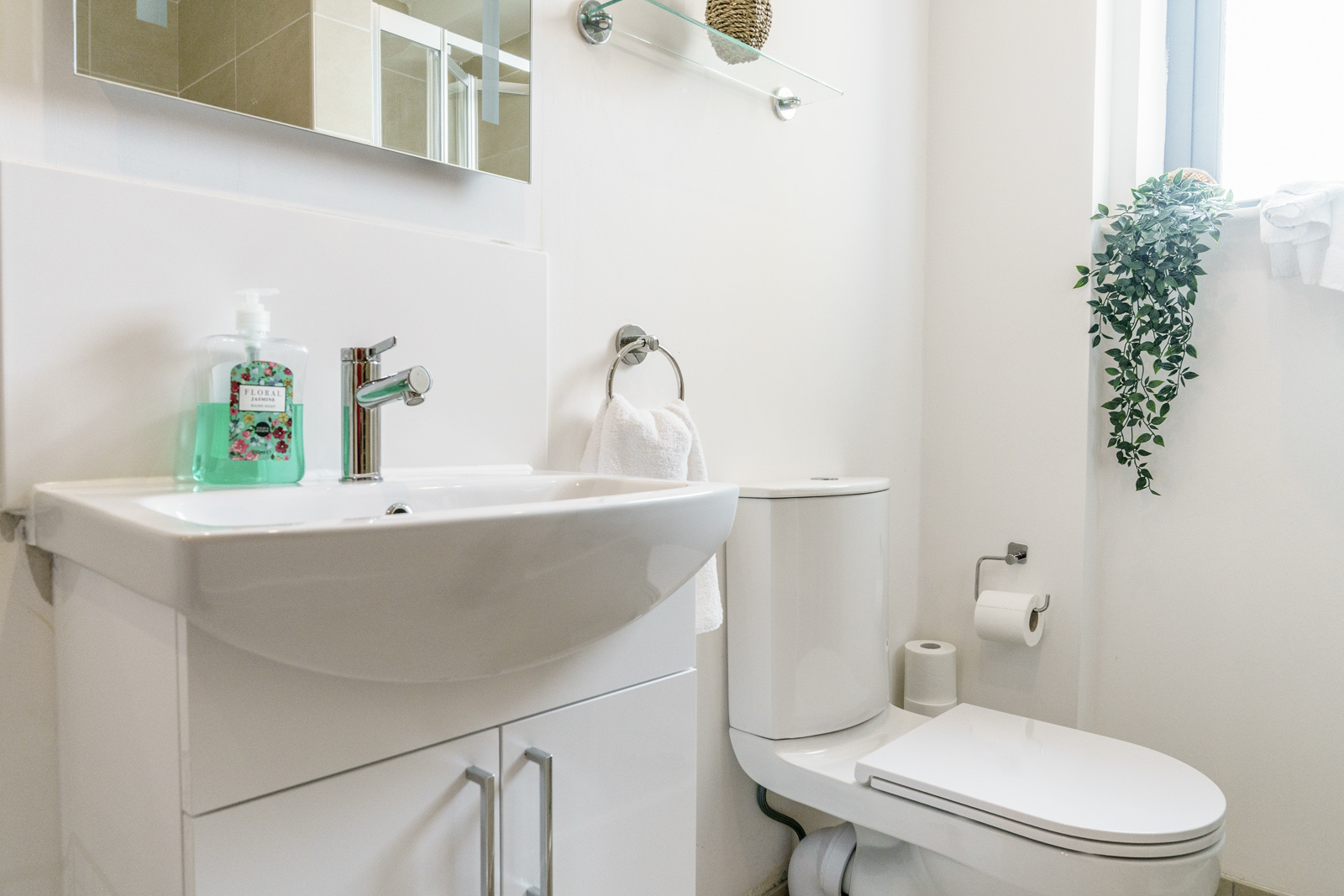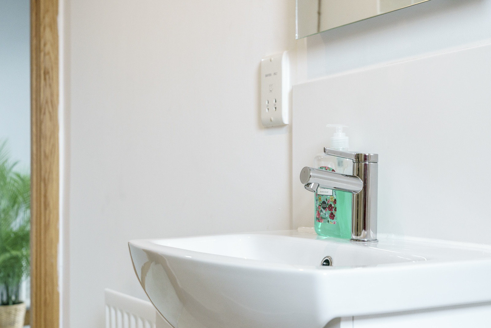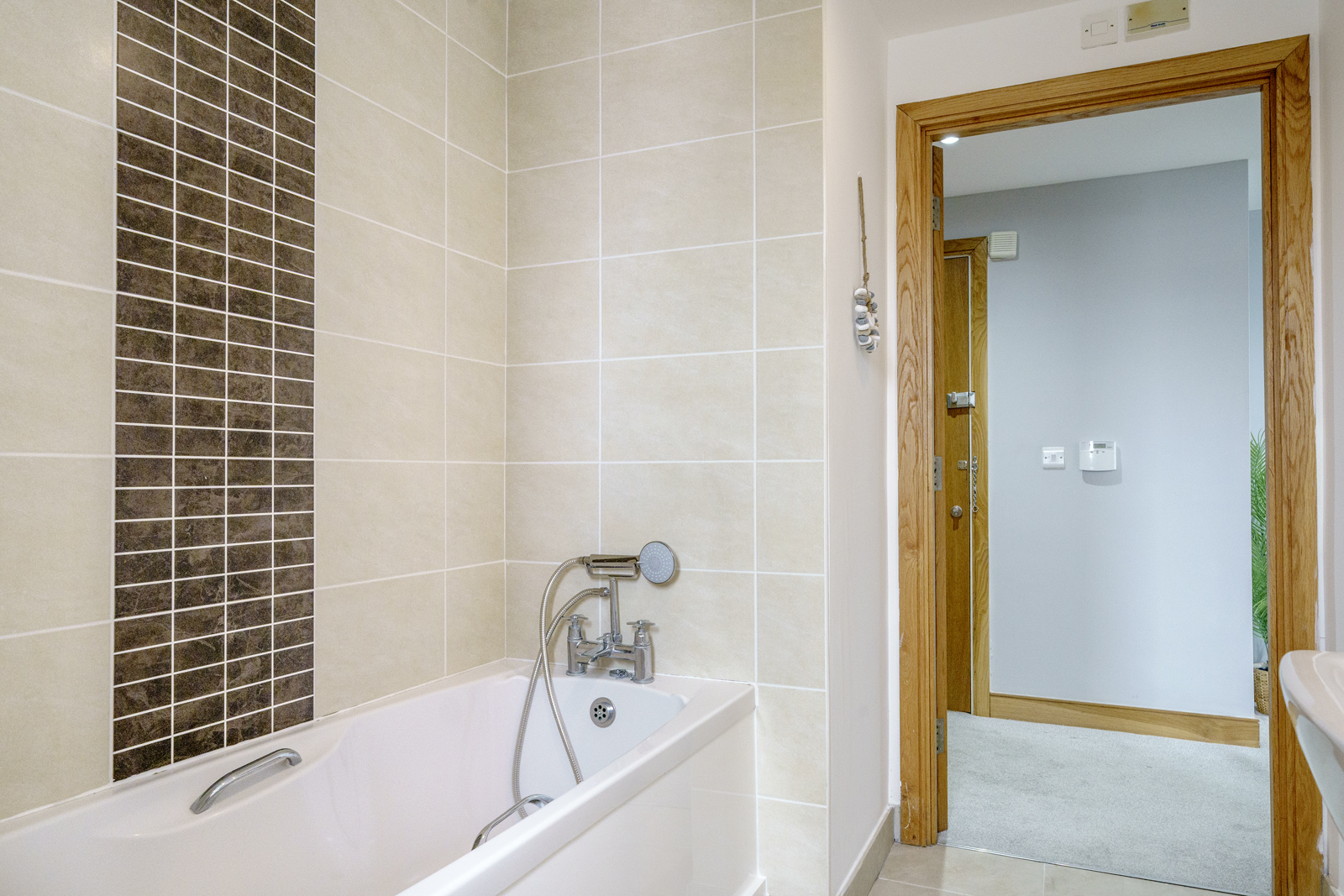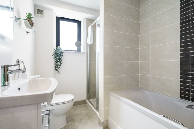 The bathroom is complete with both bath and a separate shower and has been designed with calming colours to help relax.