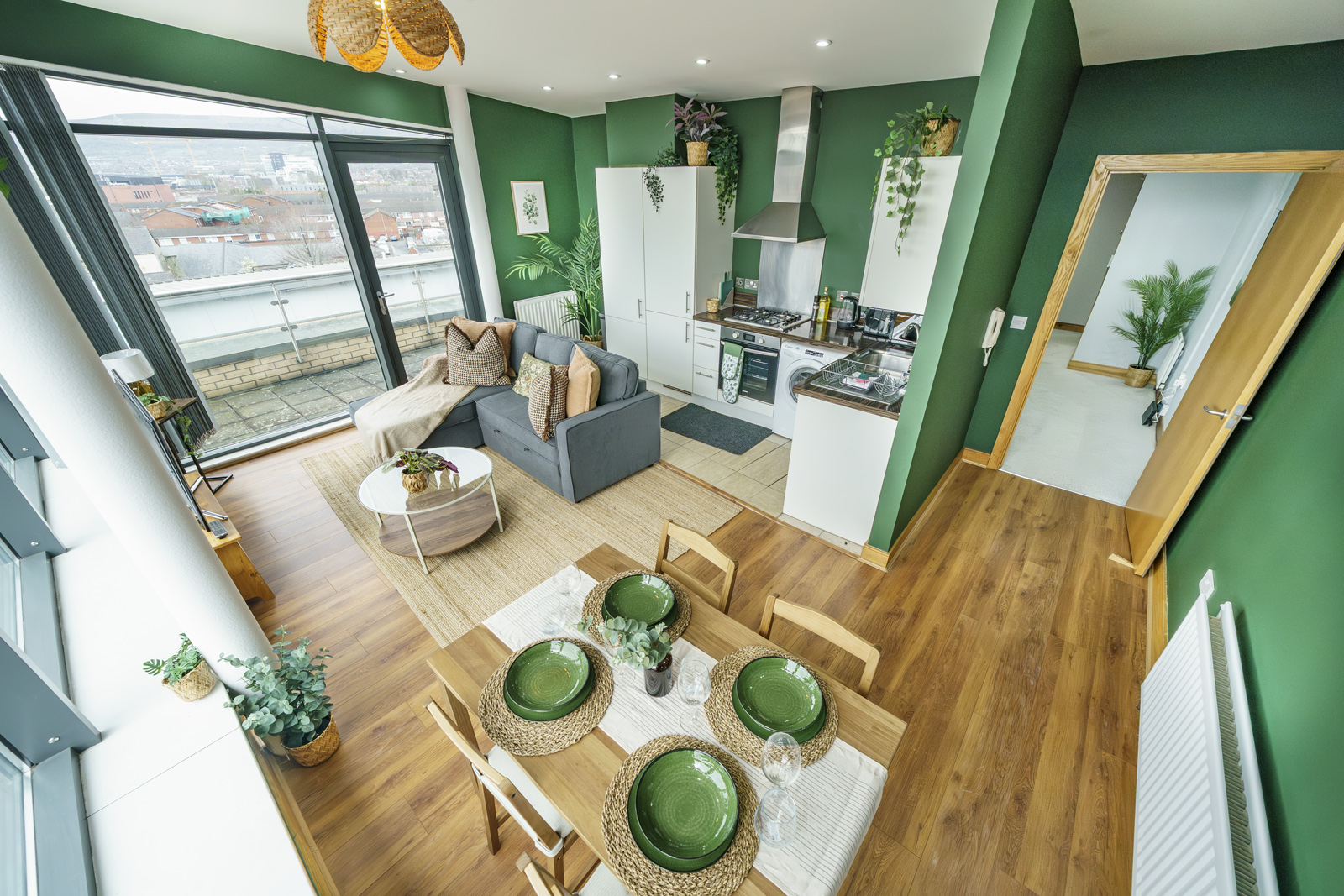 Open plan kitchen/dining/living area opens up into a balcony overlooking the city and mountains. This makes for stunning sunset views when lucky enough to have the weather.