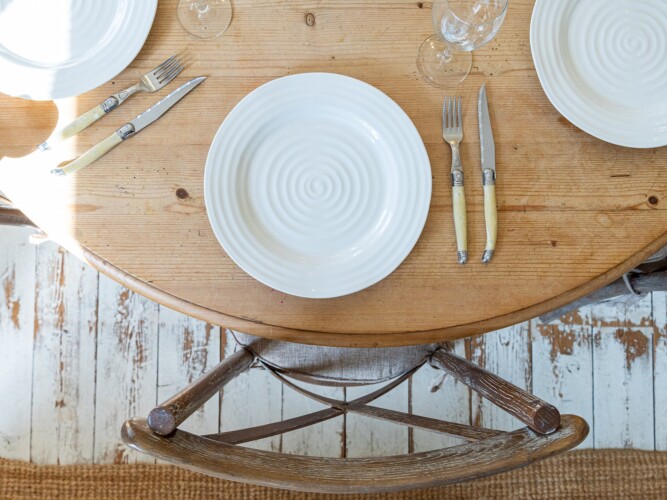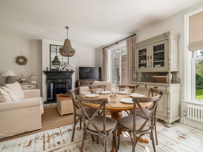 🏡 Open-plan living and dining area with elegant décor, a charming period fireplace and a welcoming table for relaxed meals.