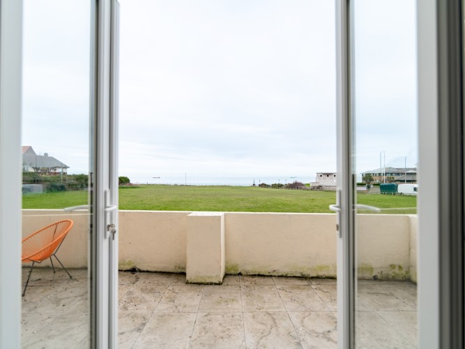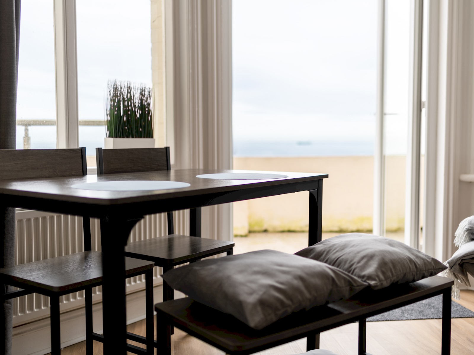 Further down the hallway you will find our stylish and cosy lounge, containing a dining table with seating, a comfy sofa, arm chair, rug, lamp, and a smart TV. The real star of the show is the floor-to-ceiling windows, overlooking the gorgeous greenery in front of the cliff leading down to the beach, with the sparkling sea in view.