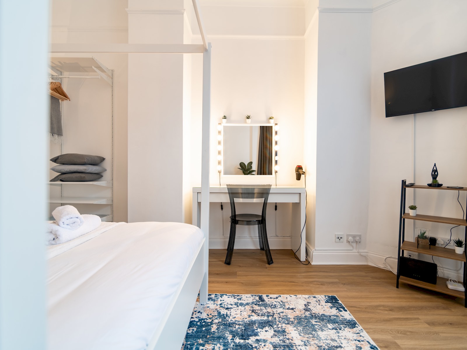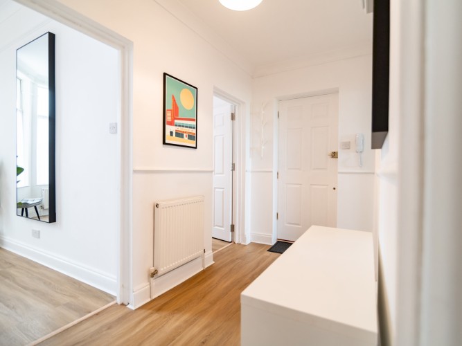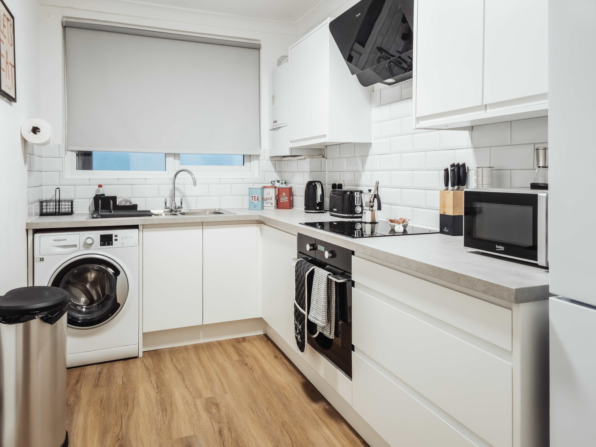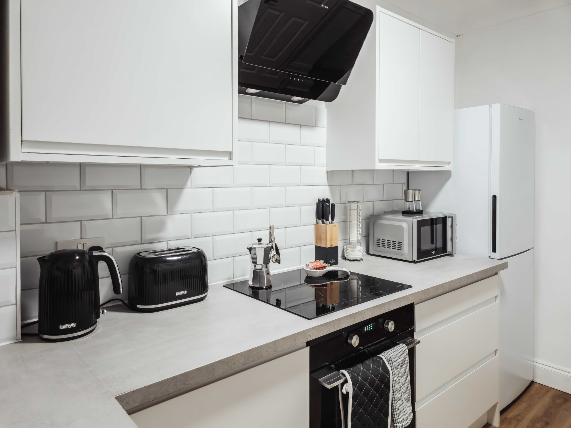 Enter through the apartment door and into the spacious hallway. On the left is the modern kitchen, equipped with all the kitchen essentials you need such as a toaster, kettle, coffee maker, fridge/freezer,
