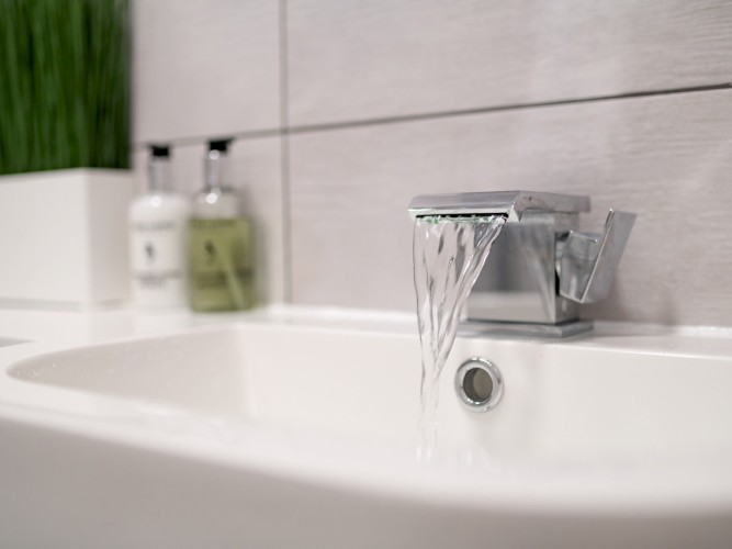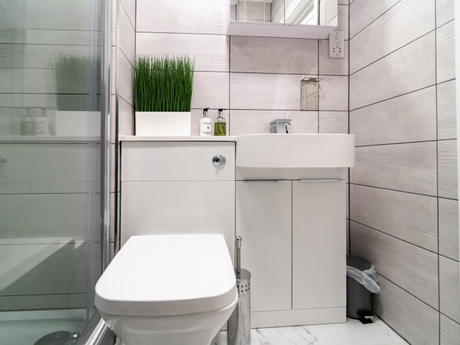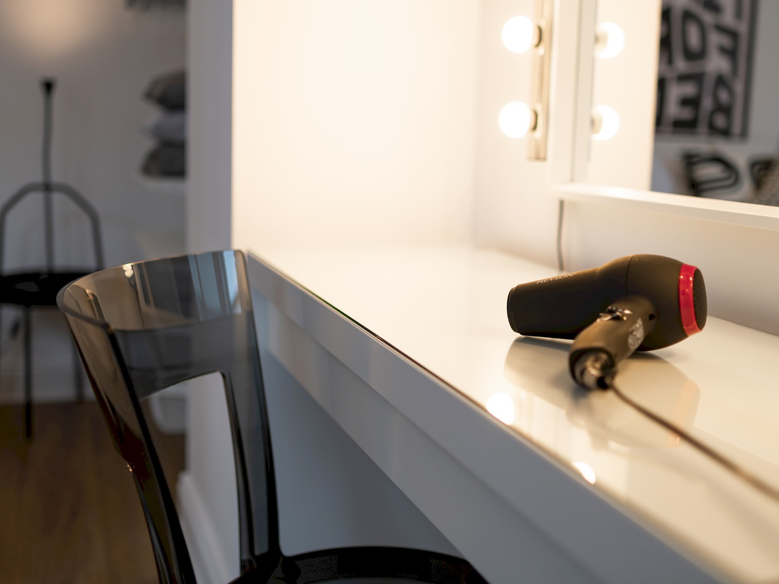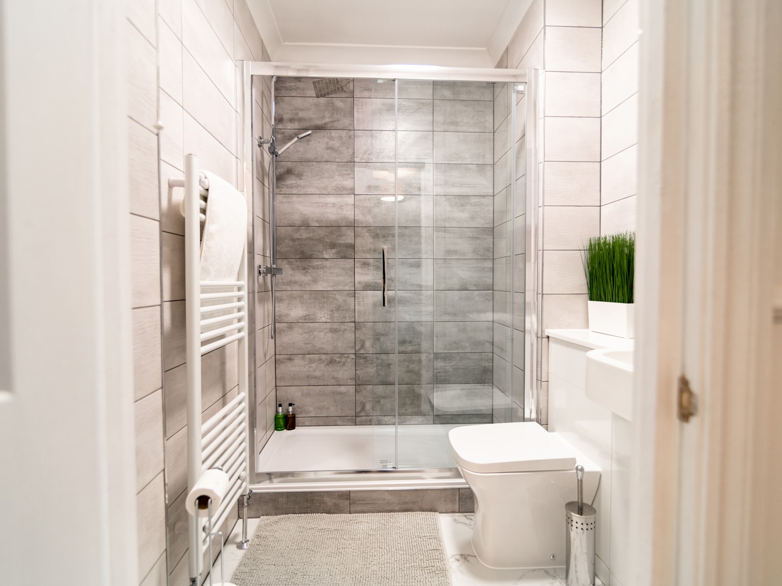 Enter through the apartment door and into the spacious hallway. On the left is the modern kitchen, equipped with all the kitchen essentials you need such as a toaster, kettle, coffee maker, fridge/freezer,