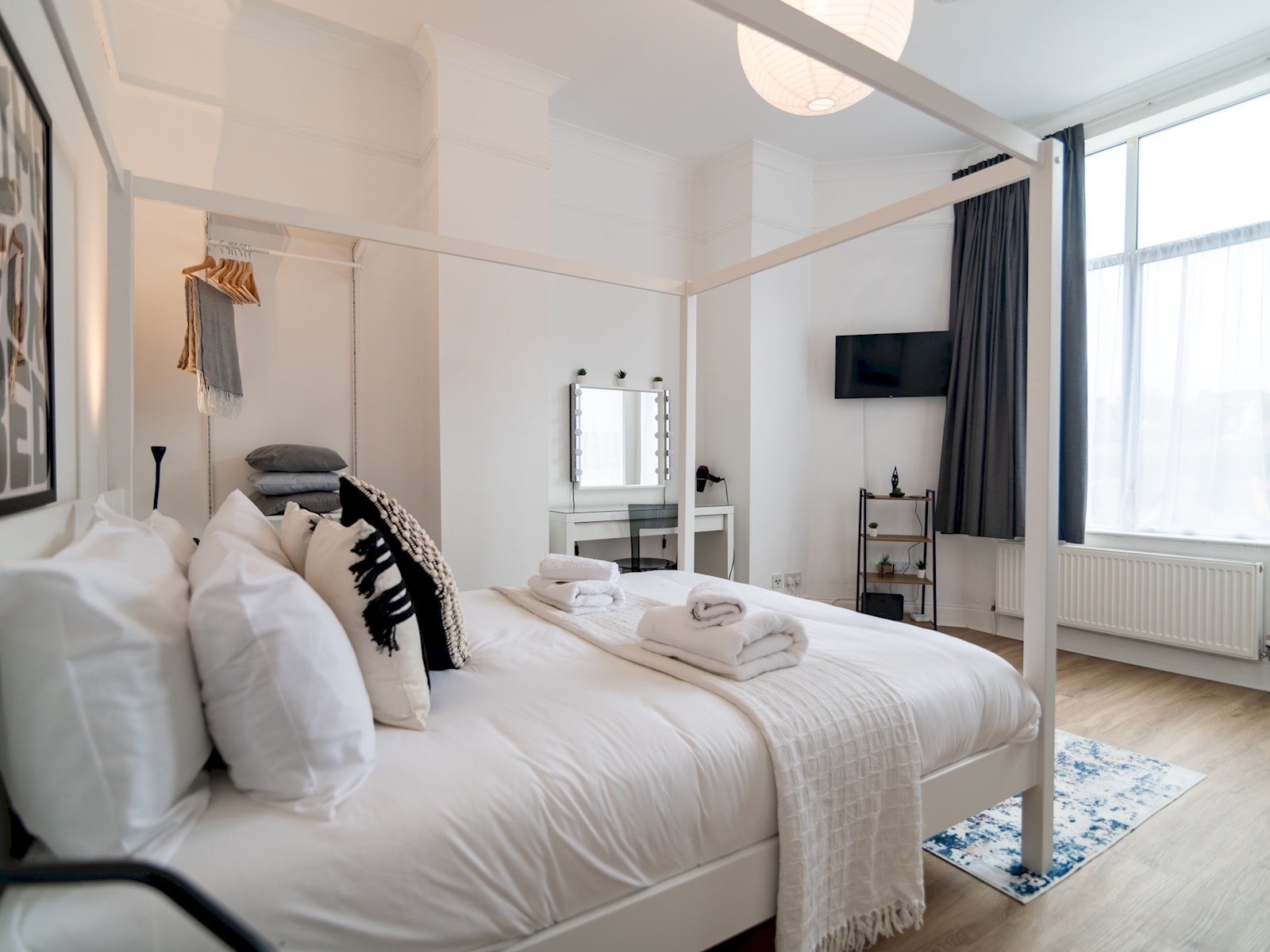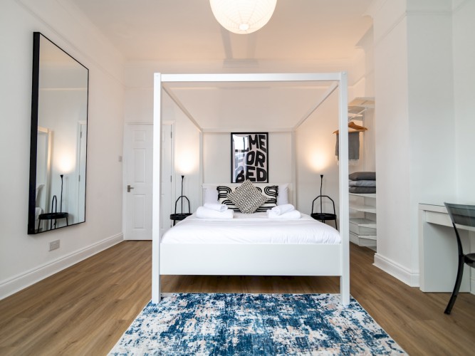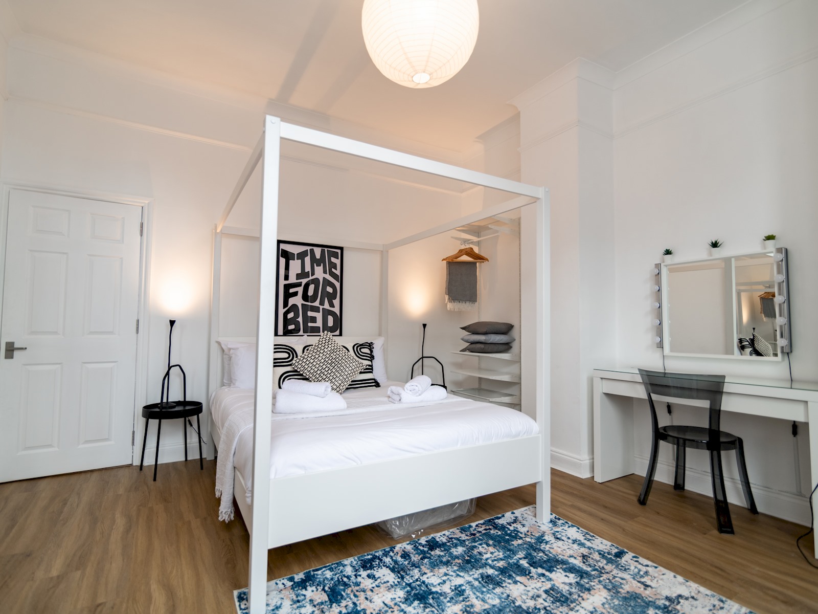 Opposite the lounge, you will discover the main bedroom, containing a lavish 4-poster king sized bed for your ultimate comfort, as well as a vanity area with mirror, bedside tables with lamps, TV and wall mounted wardrobe space.