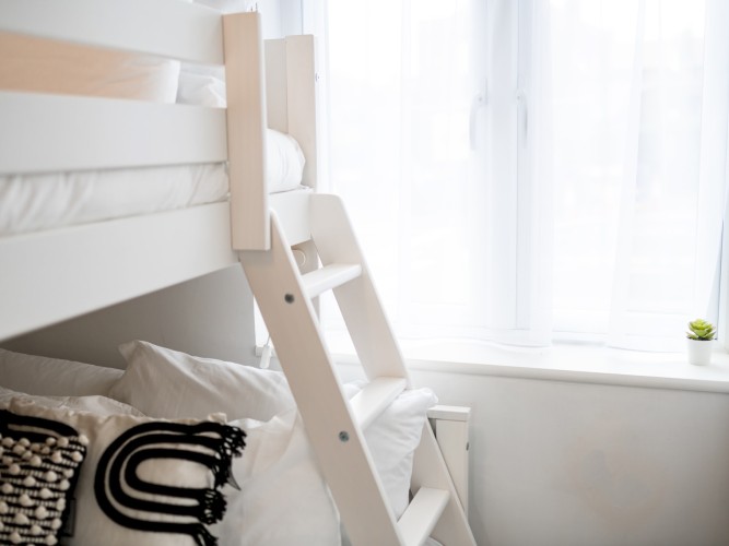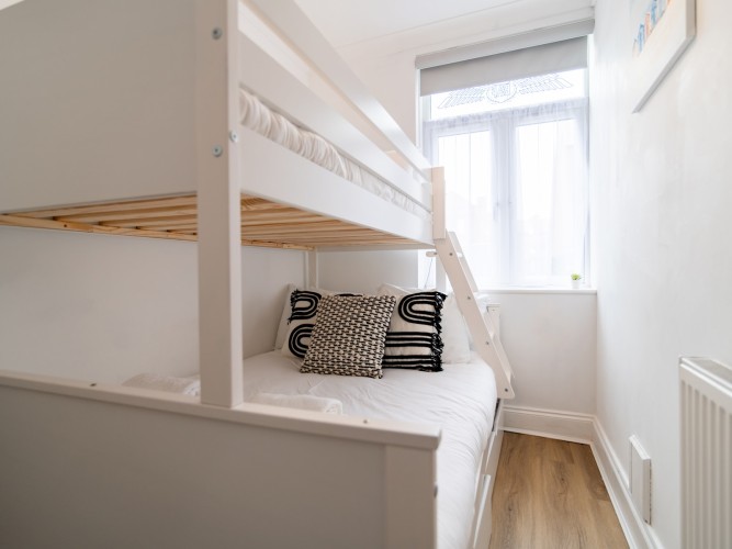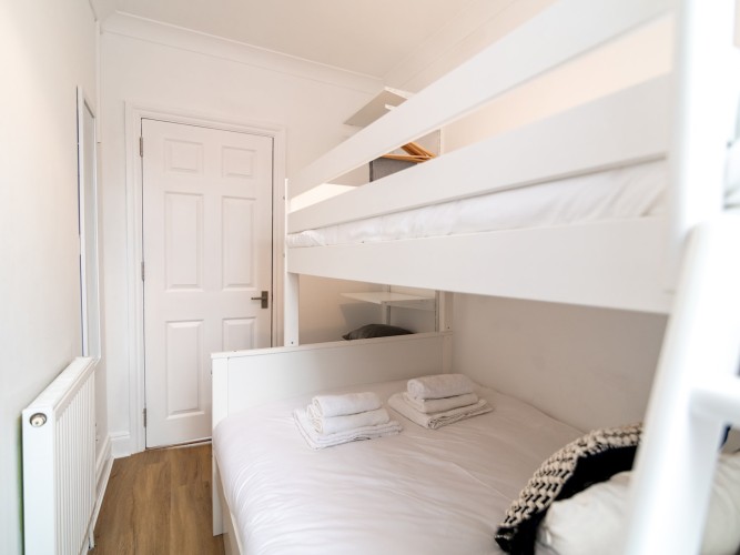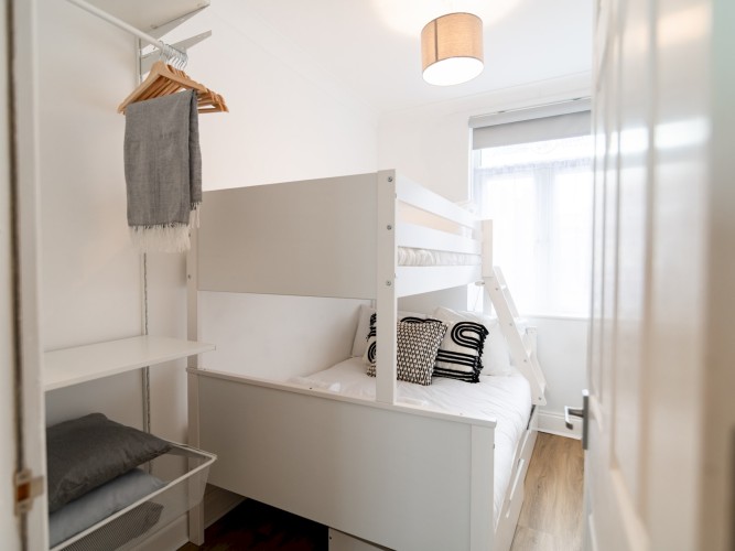 Past the main bedroom you will find another cosy family-style bedroom containing a large bunk bed with a double and single bed, lamp, wall mounted wardrobe space and TV.