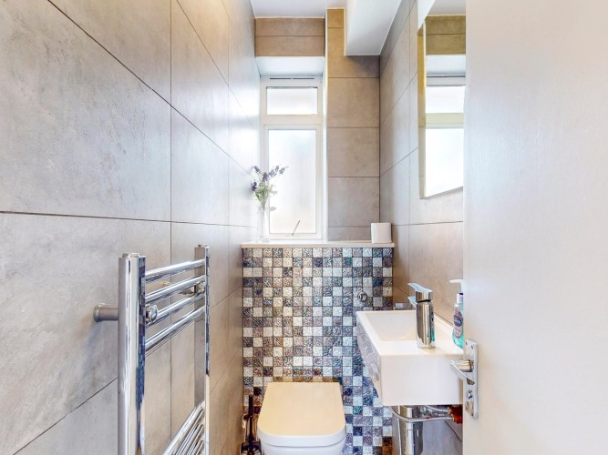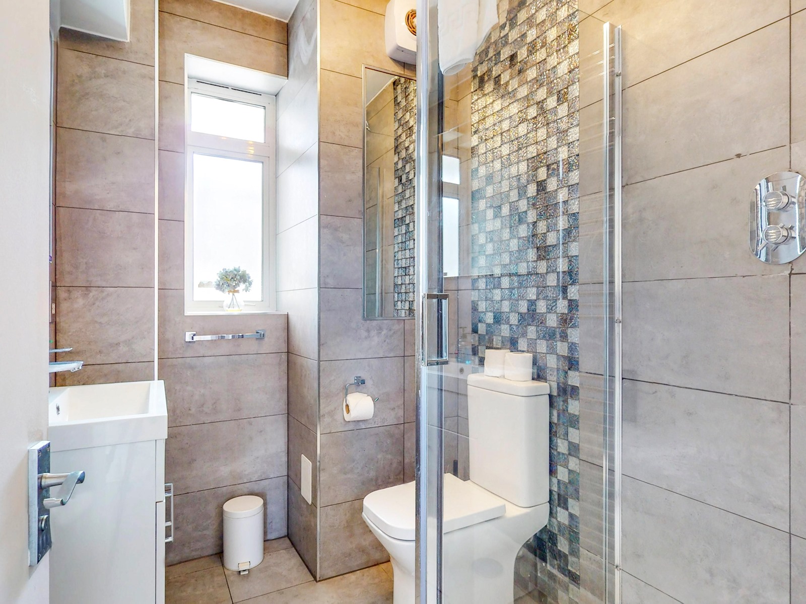 The flat boasts three double bedrooms with contemporary interiors and homely touches. There’s ample storage space, and fans are provided for those hot summer months. The property includes a stylish bathroom with a serene grey color scheme and an additional separate WC.