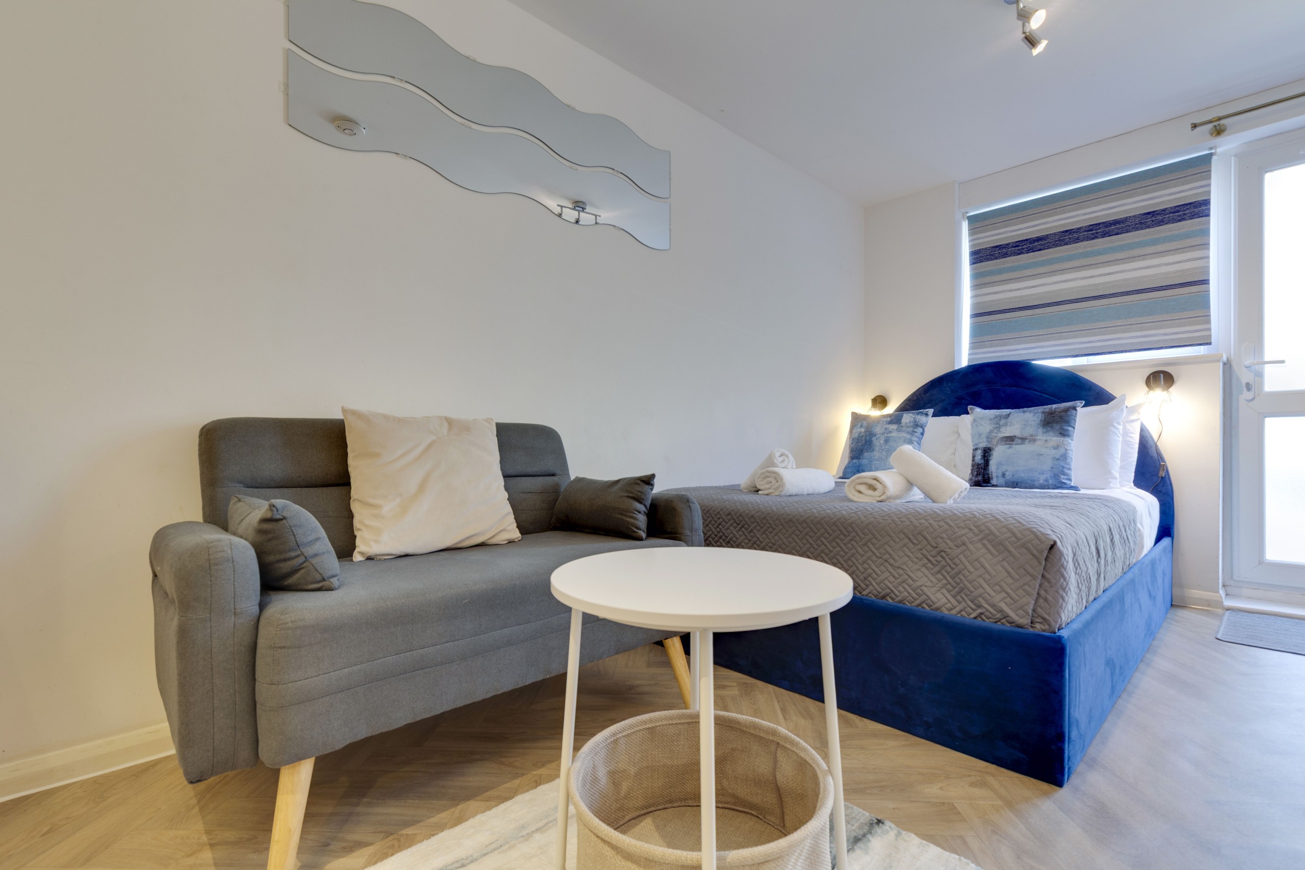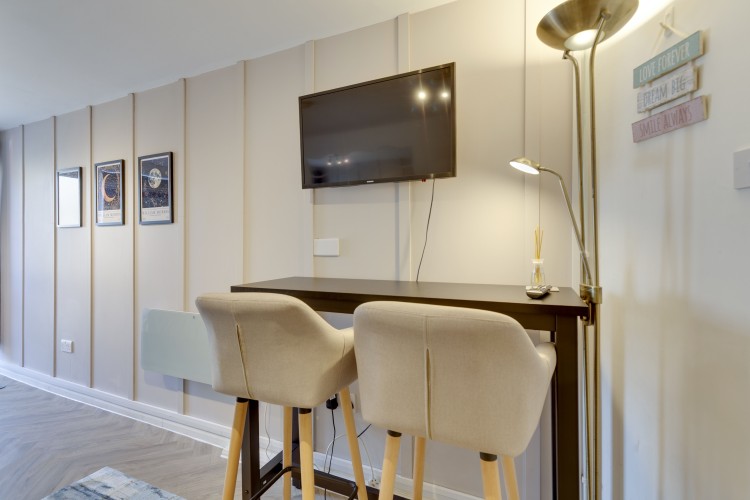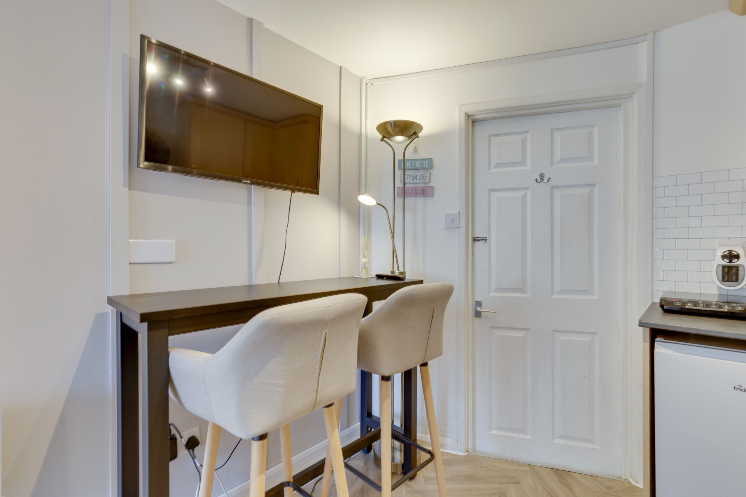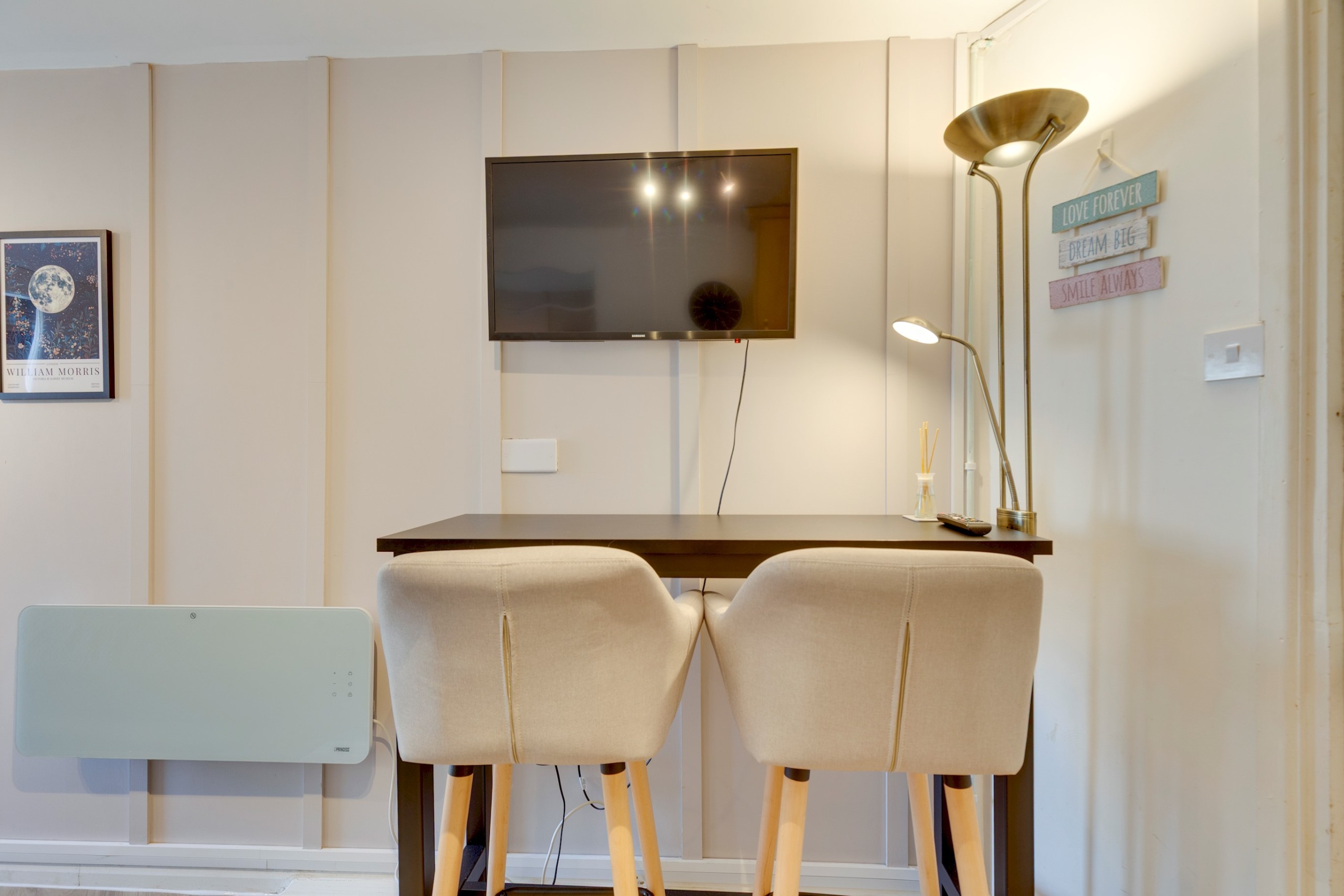 An open plan living area with a two-seater sofa, and a breakfast bar for eating or to use as a workspace, is available for guests. Superfast wifi for work or study, or to stream your favourite channel. An enclosed private garden patio area with outdoor furniture is available to enjoy those sunny days.