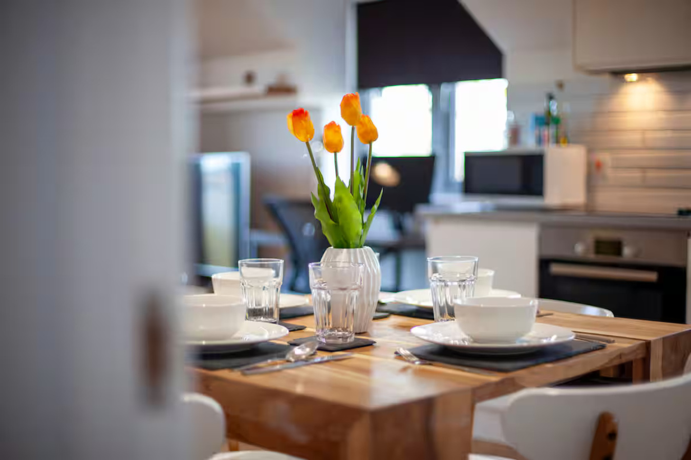 The modern kitchen is generously sized, and fully equipped for home dining. Use of appliances include an oven, electric hob, small fridge-freezer, and a dishwasher. Smaller appliances include a microwave, toaster, and kettle. There is also a washing machine/dryer available for personal use.