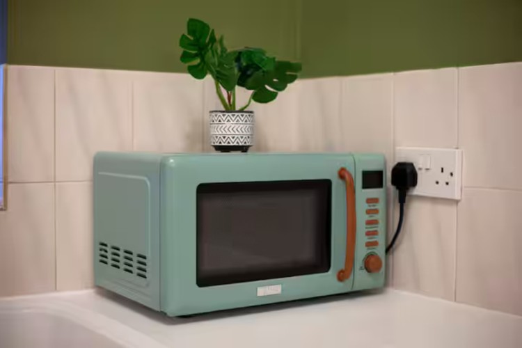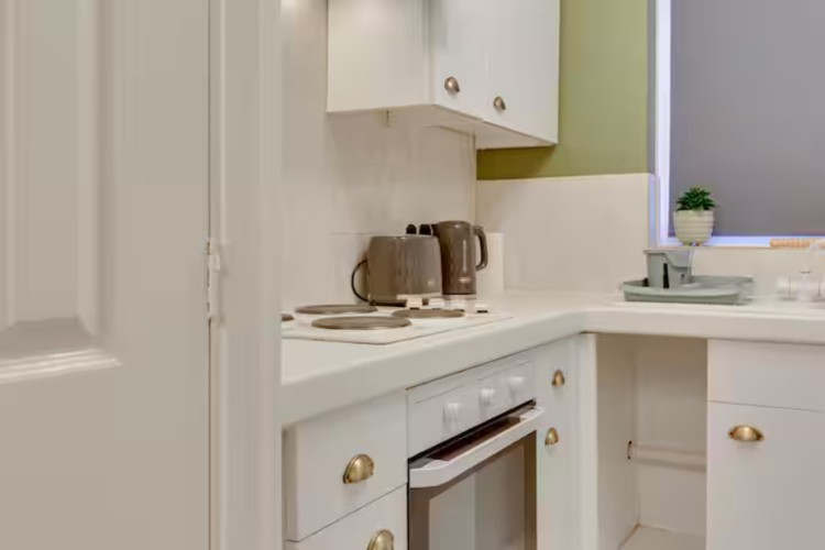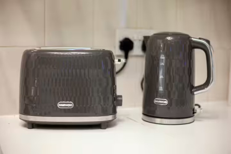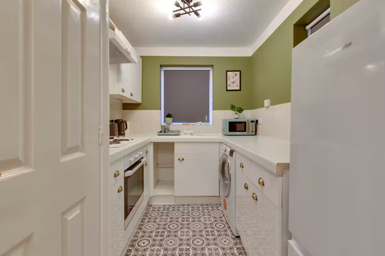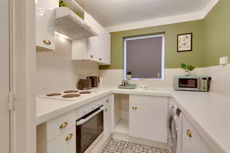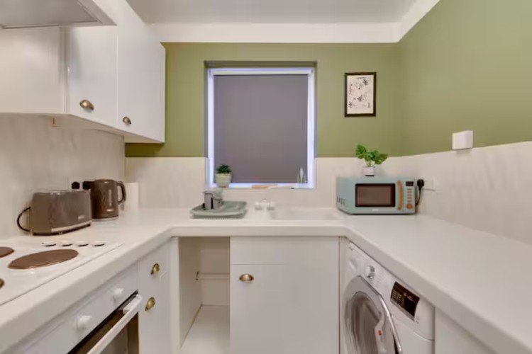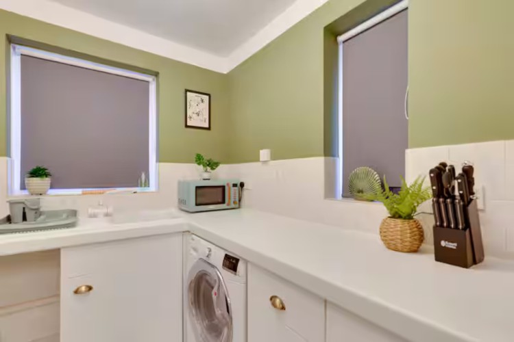 A fully equipped kitchen is provided for home dining. Use of appliances include an oven, electric hob, and fridge-freezer. Smaller appliances include a microwave, toaster, kettle, with some condiments provided. There is also a washer-dryer machine available in the property for personal use.