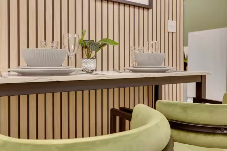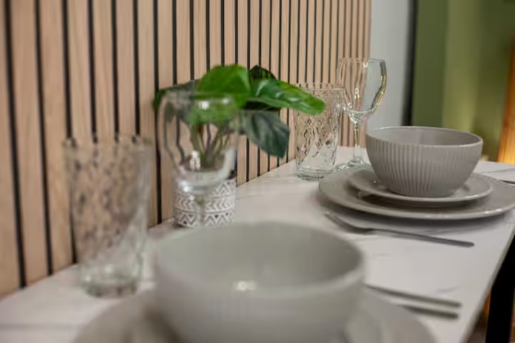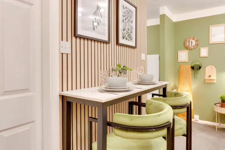 Well appointed open plan living/dining area with a flat screen 40 inch Smart TV, and all your favourite streaming channels installed – Netflix, Amazon Prime, Youtube and Disney Plus. Own account required for viewing. The dining area also doubles as a working desk area, and a super fast wifi connection of 100Mbps is provided for free.