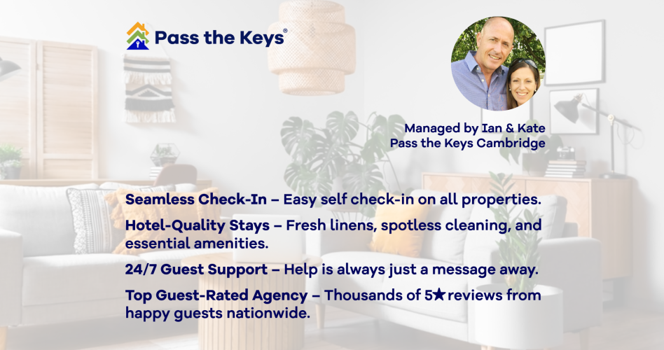 Ian and Kate are the new local contact and owners of the Pass the Keys franchise in Cambridge. They are committed to providing owners with exceptional service, reliable income growth, and peace of mind, with the backing and support of the UK’s largest and award winning, short-let management business.