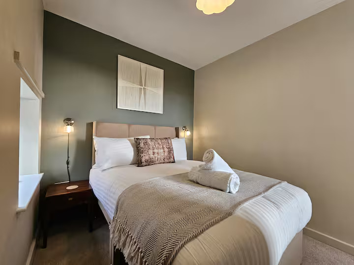 Designed for comfort and connection, the open plan layout is perfect for single travellers, couples or friends. The lounge offers a comfy sofa against rich colour wall tones. The kitchen comes fully equipped for home cooking, including dishwasher, washing machine, and full size fridge and freezer. The dining table sets the scene for relaxed meals and memorable evenings together!