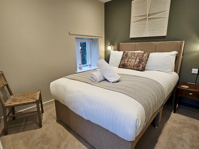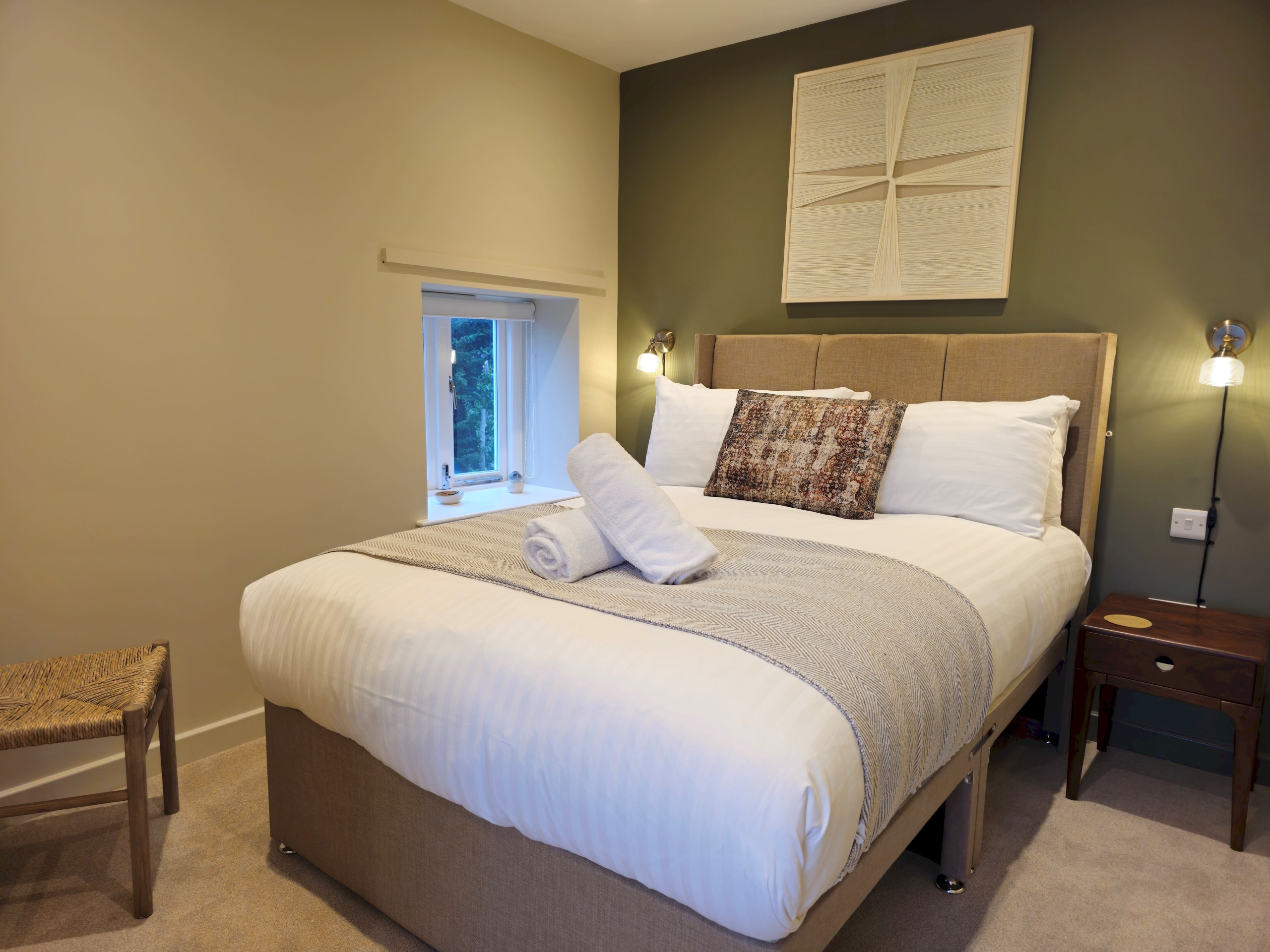 An elegantly styled room, which features a plush velvet headboard, deep pocket-sprung mattress, and cotton bedding for a restful night.
