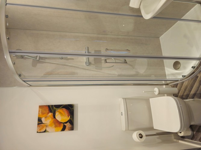A spacious and light-filled bathroom awaits you. With glass-enclosed shower. Towels, shampoo, body wash, and hand soap are provided for your comfort.