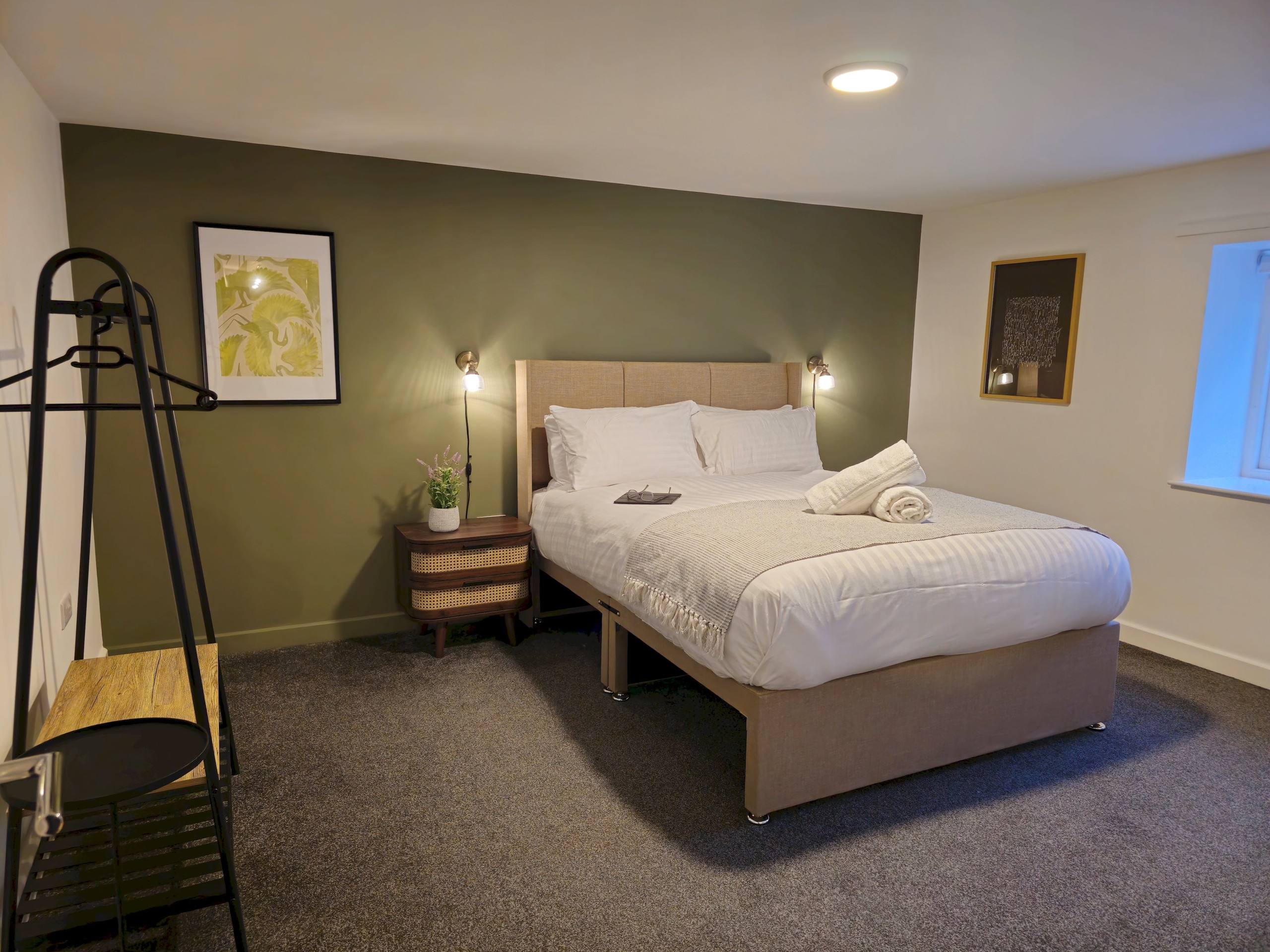 An elegantly styled room, which features a plush velvet headboard, deep pocket-sprung king size mattress, and cotton bedding for a restful night.