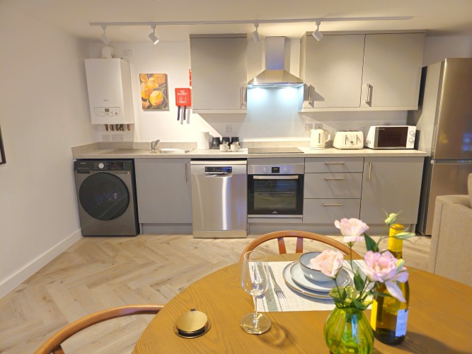 Conveniently, park at the rear of the property with step-free entrance into the apartment hallway. with shower room ahead. Walk through into the open and spacious kitchen, lounge and dining space.