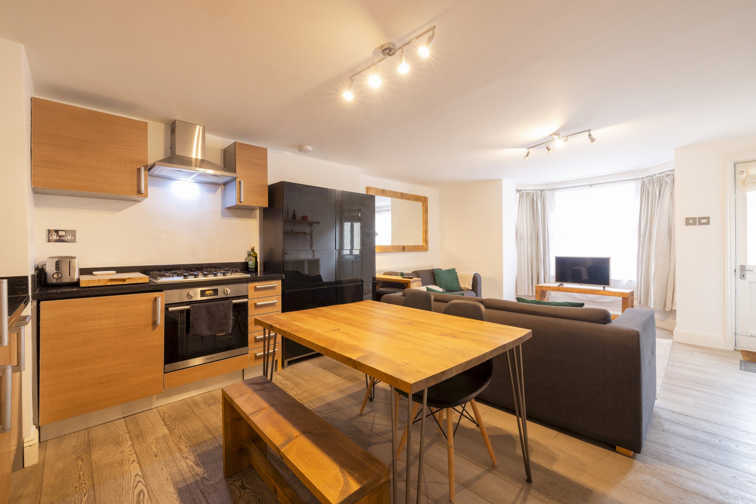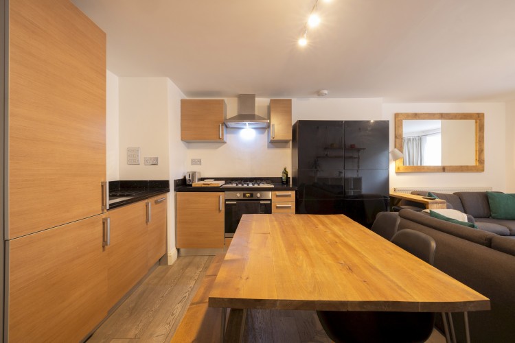 Enter this stylish designed single level apartment. You will find an open plan living-dining area where you can enjoy some downtime with family and friends after exploring London. There are two sofas, a TV and a dining table. There is a kitchen which is fully equipped with modern appliances and includes all the cooking utensils necessary to whip up your meal of choice.