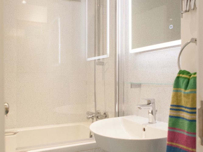 The apartment boasts a naturally bright open-plan kitchen fully equipped with pots and pans, crockery and champagne flutes for those of you looking to cook and spend a chilled night in.