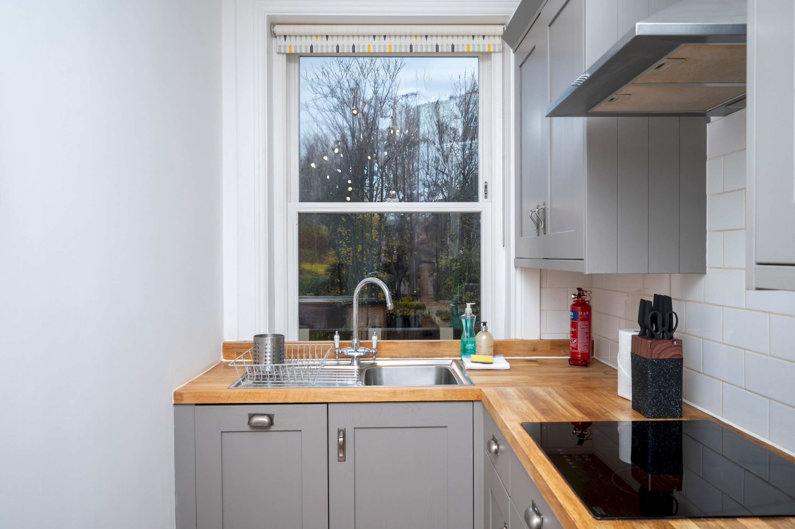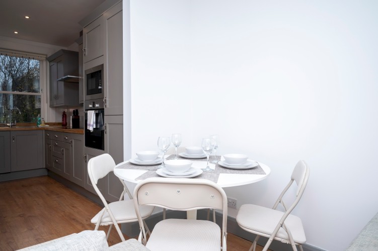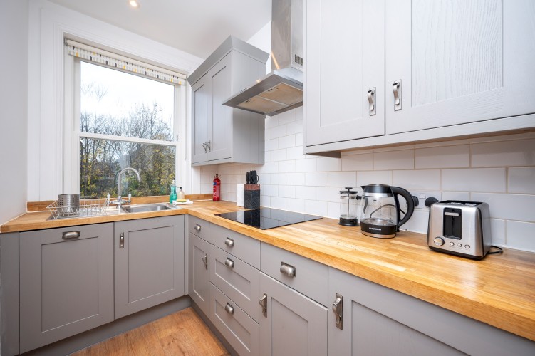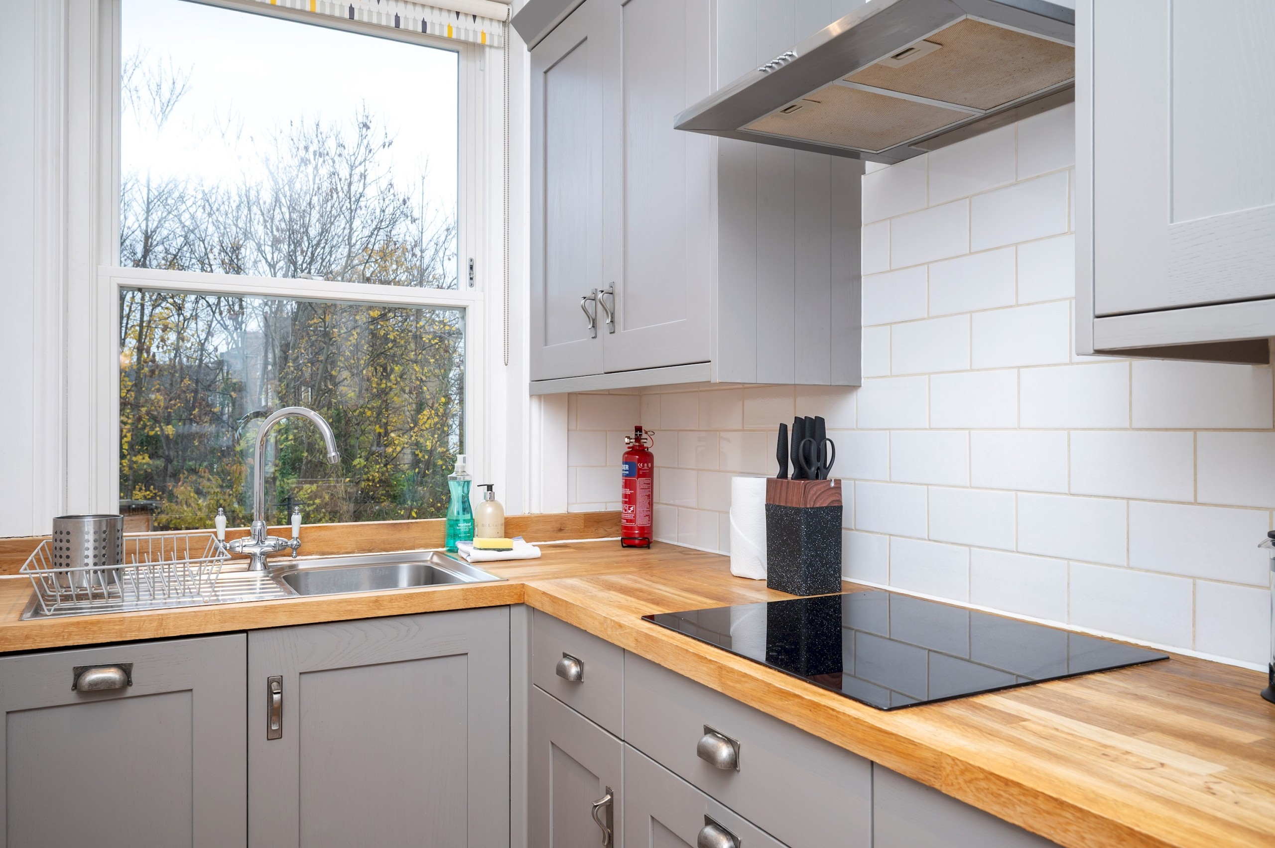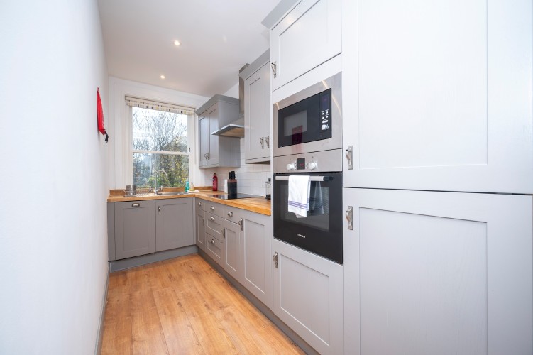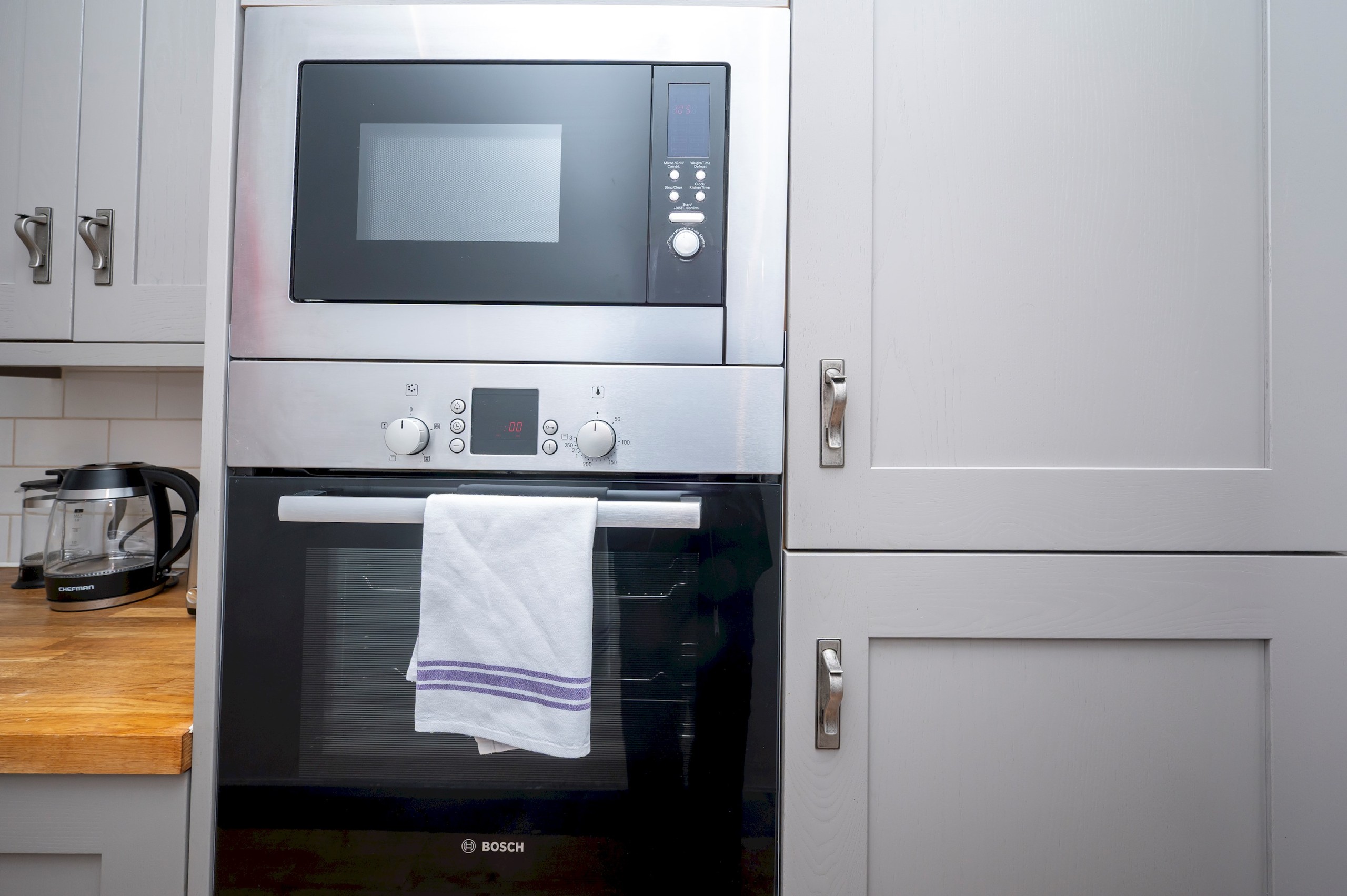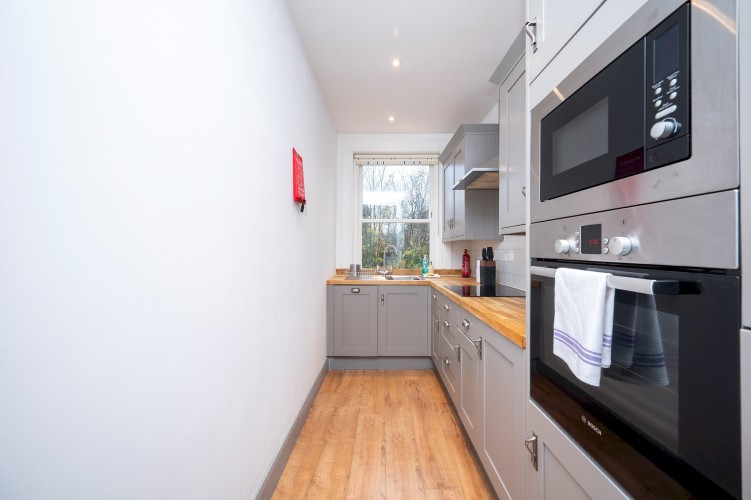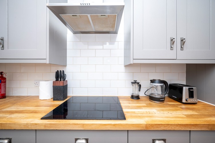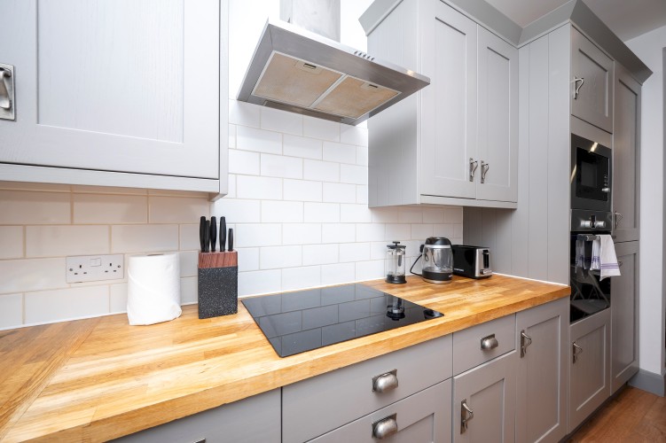 The fully equipped kitchen includes everything you need to cook at home: oven, hob, fridge-freezer, microwave, kettle, and essential cookware.