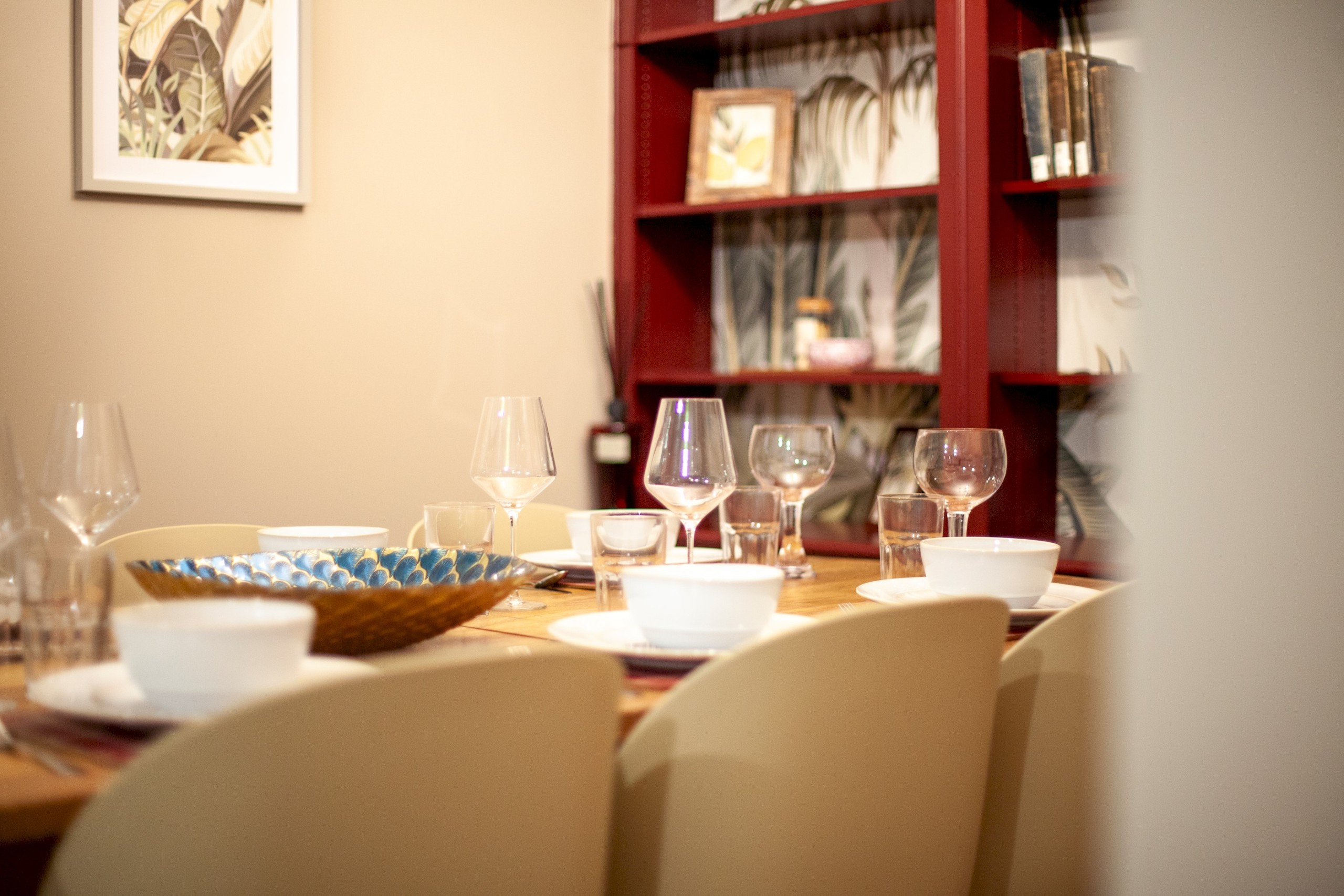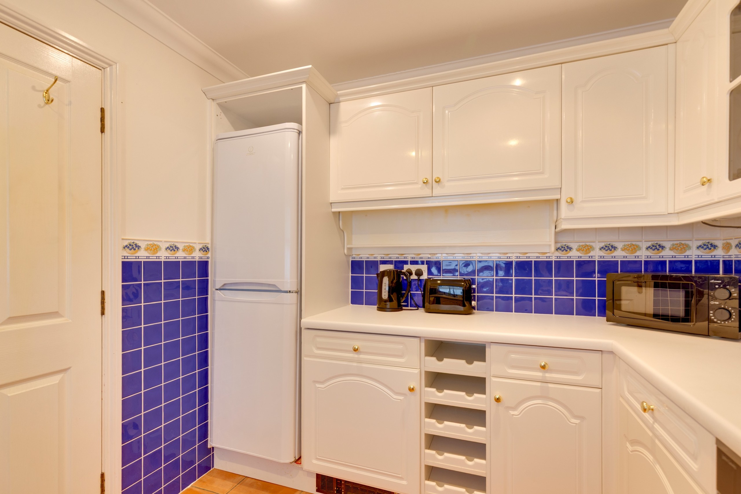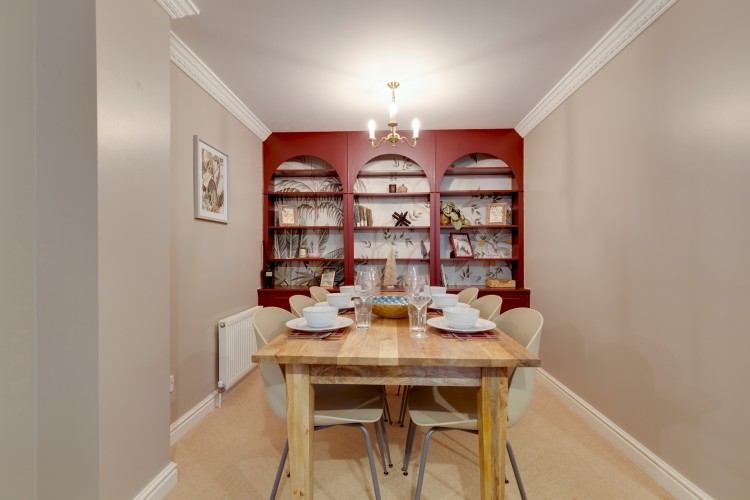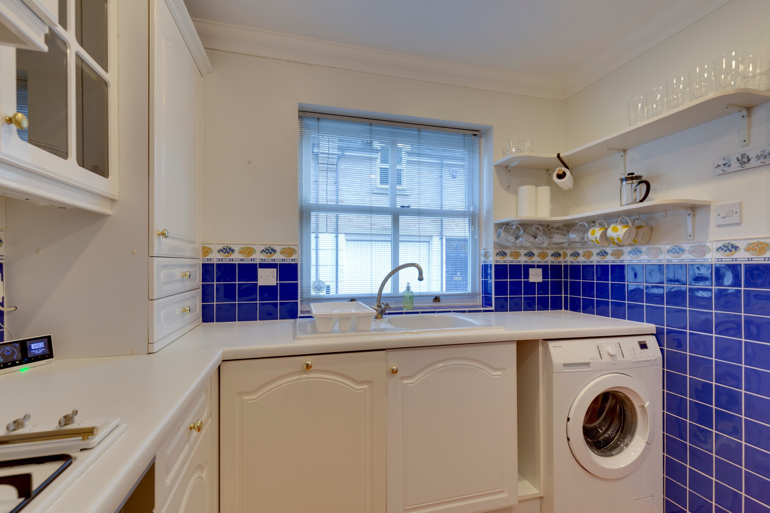 The modern kitchen is generously sized, and fully equipped for home dining. Use of appliances include an oven, gas hob, fridge-freezer, and a dishwasher. Smaller appliances include a microwave, toaster, and kettle. There is also a washing machine (no dryer) available for personal use.
