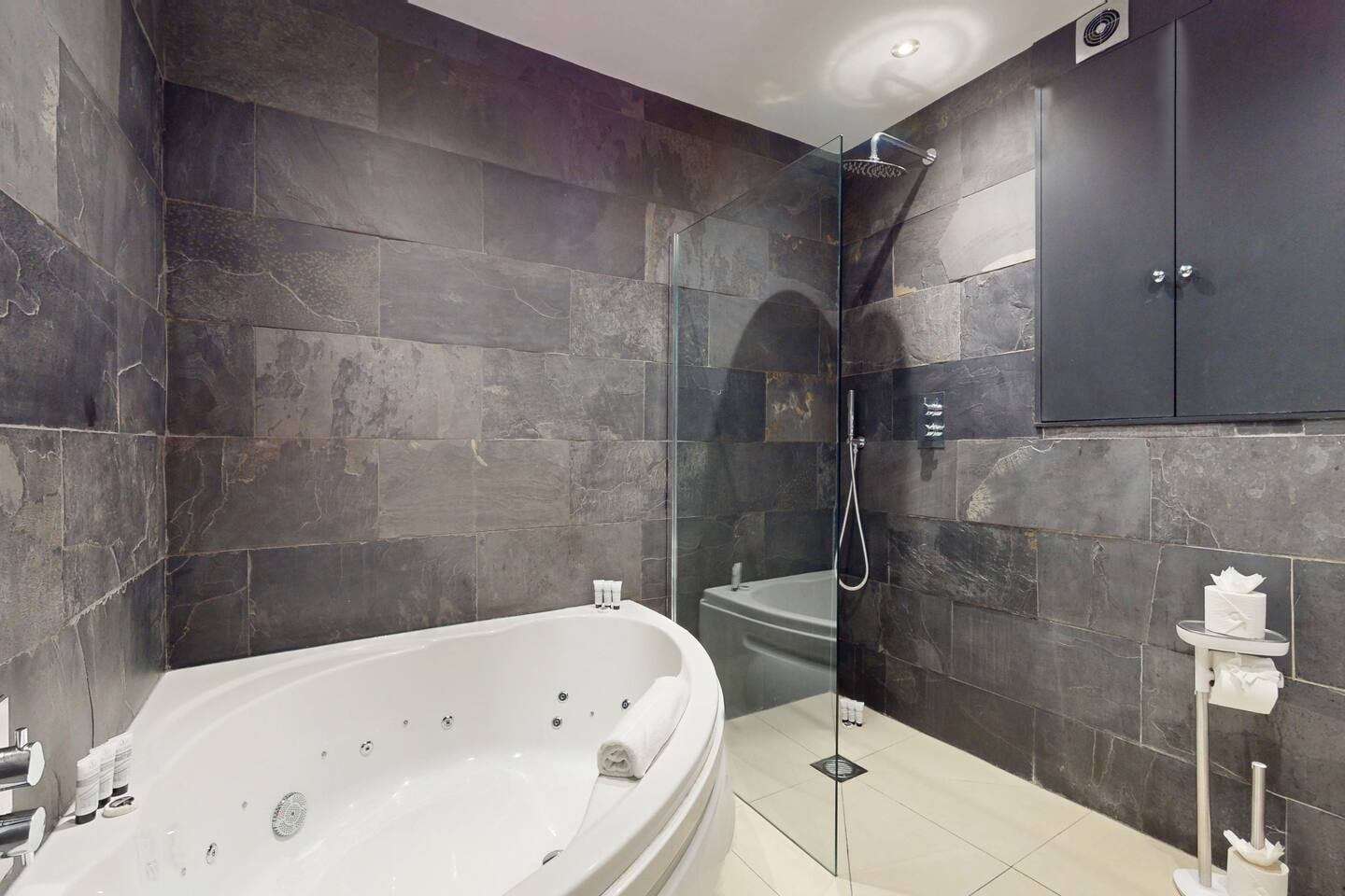 Both bedrooms have their own rhythm. The principal suite feels cocooned and calm, with soft lighting, built-in storage, and a sleek en-suite shower room. The second double is bright and inviting, with access to the family bathroom — complete with a jacuzzi bath and underfloor heating in both bathrooms, adding a quiet touch of luxury to morning routines and late-night soaks alike.
