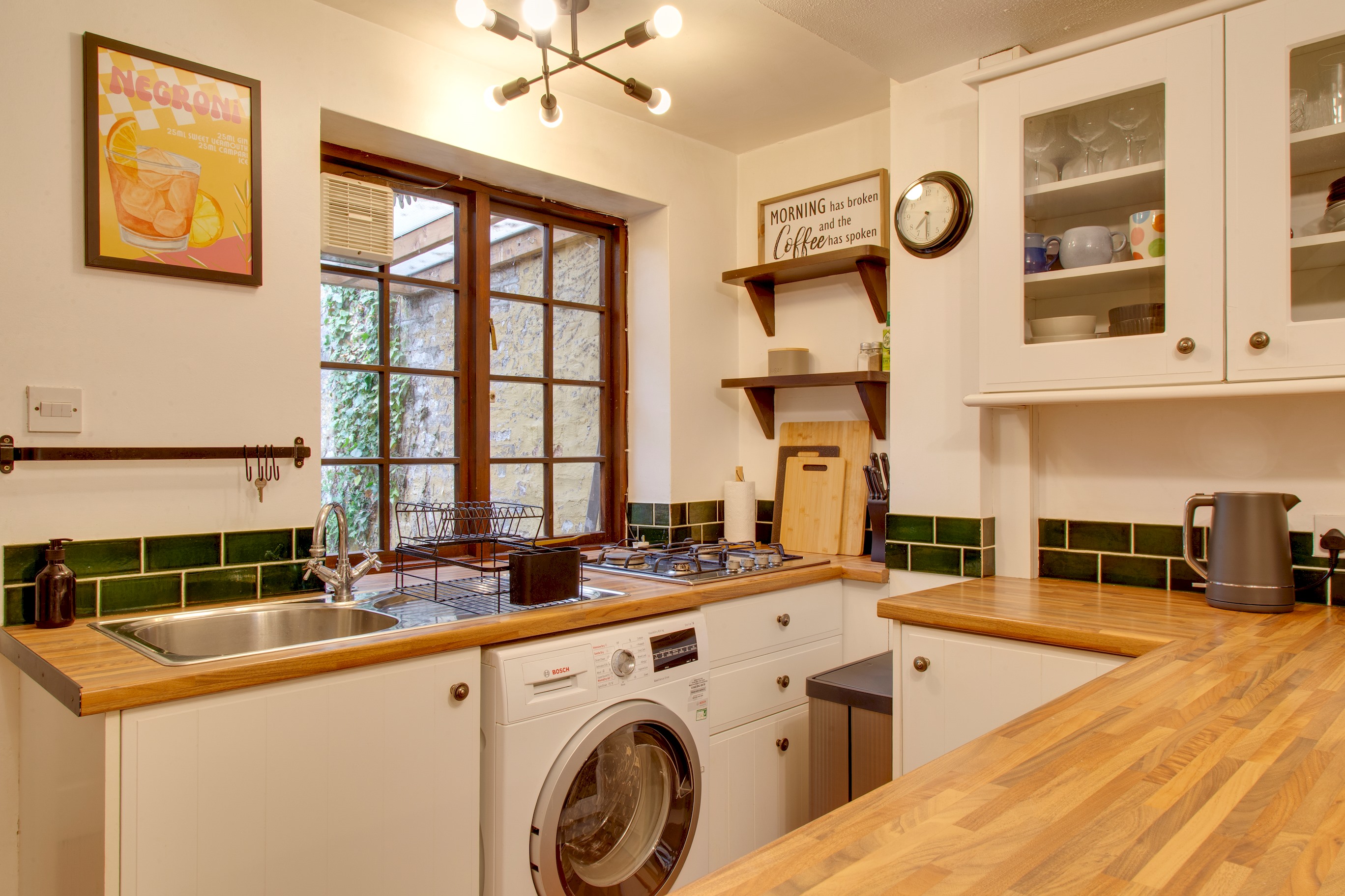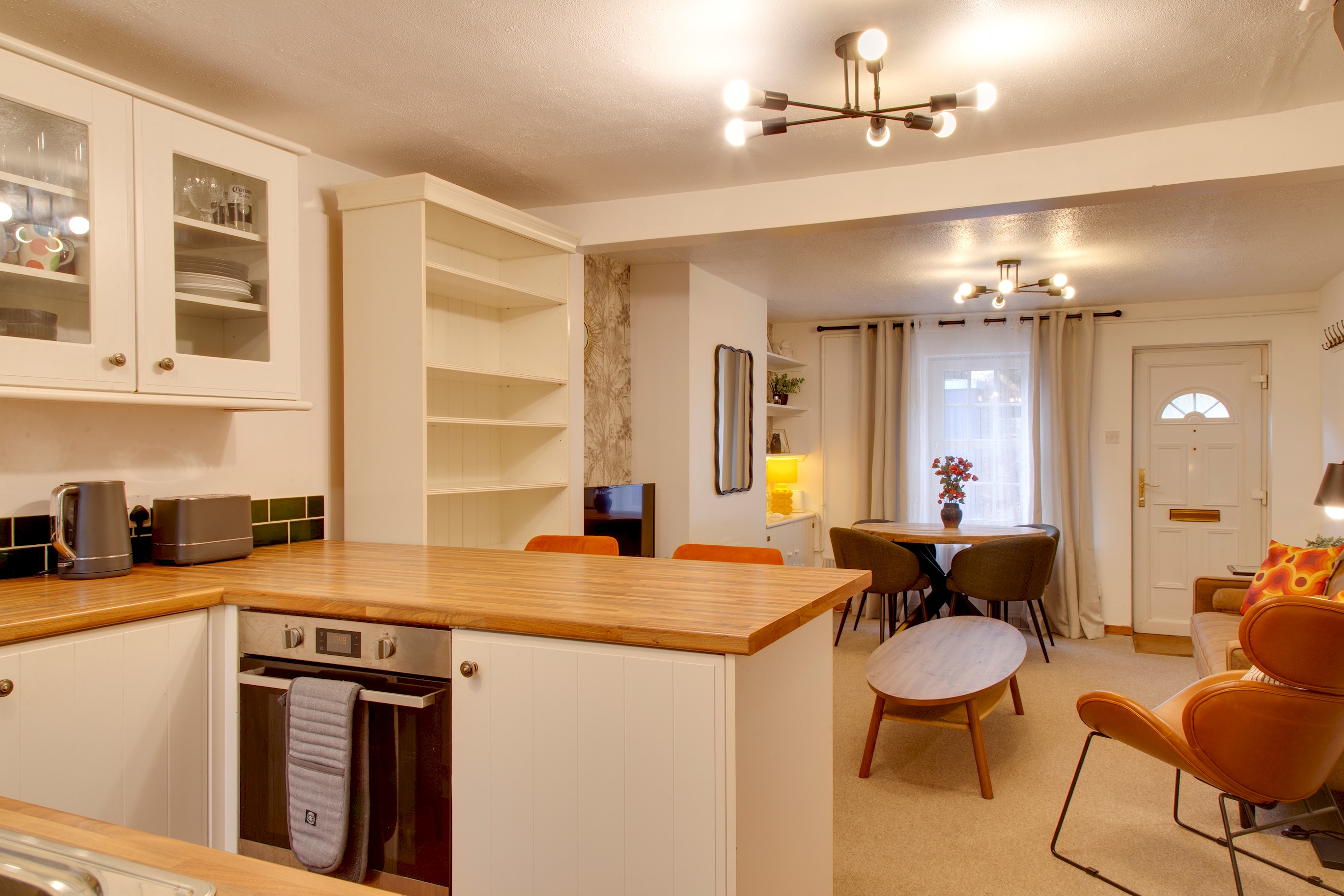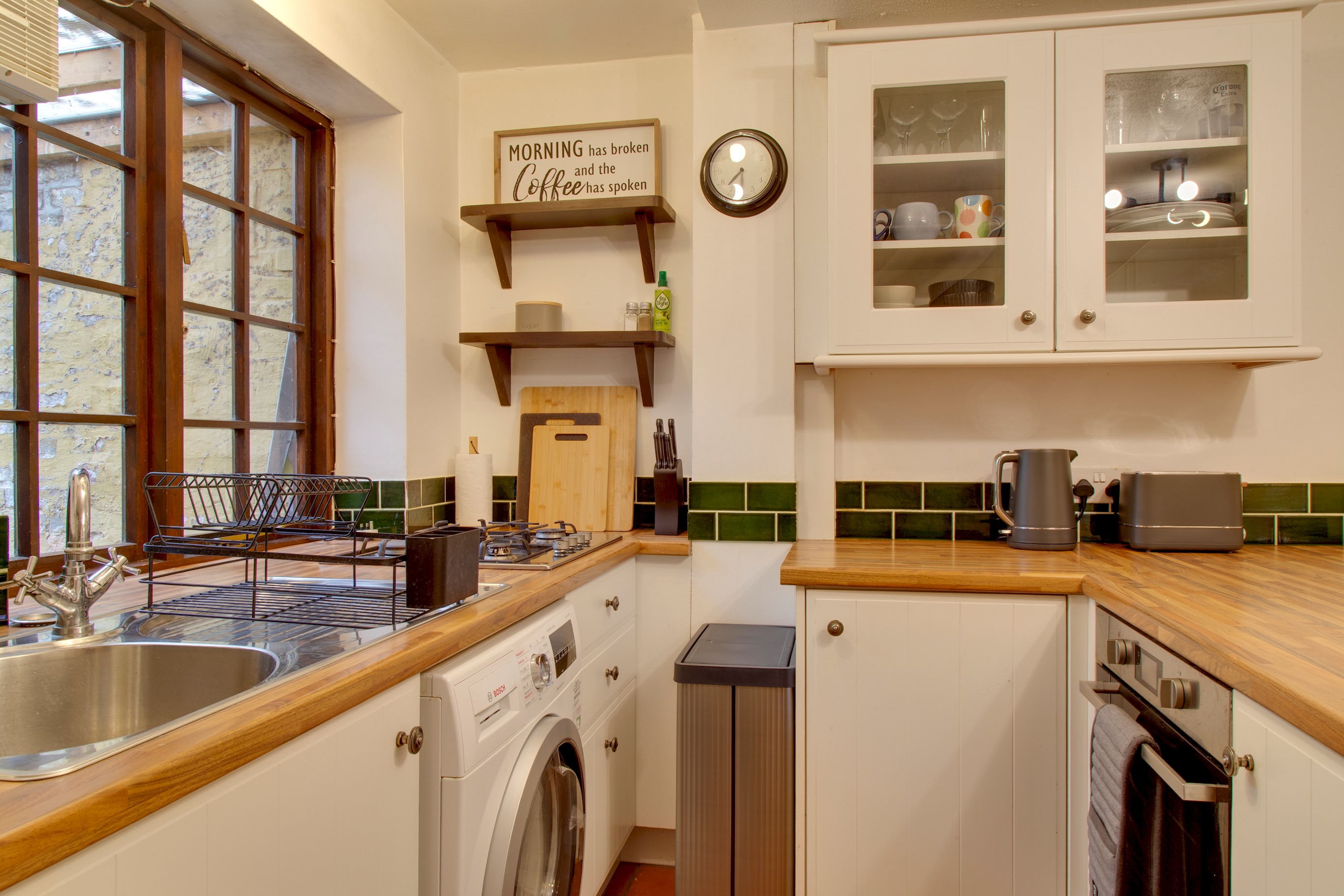 A fully equipped kitchen is provided for home dining. Use of appliances include an oven, gas hob, and fridge-freezer. Smaller appliances include a microwave, toaster, kettle, with some condiments provided. There is also a washer-dryer available in the property for personal use.