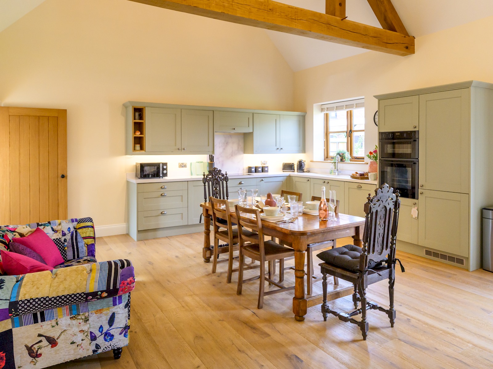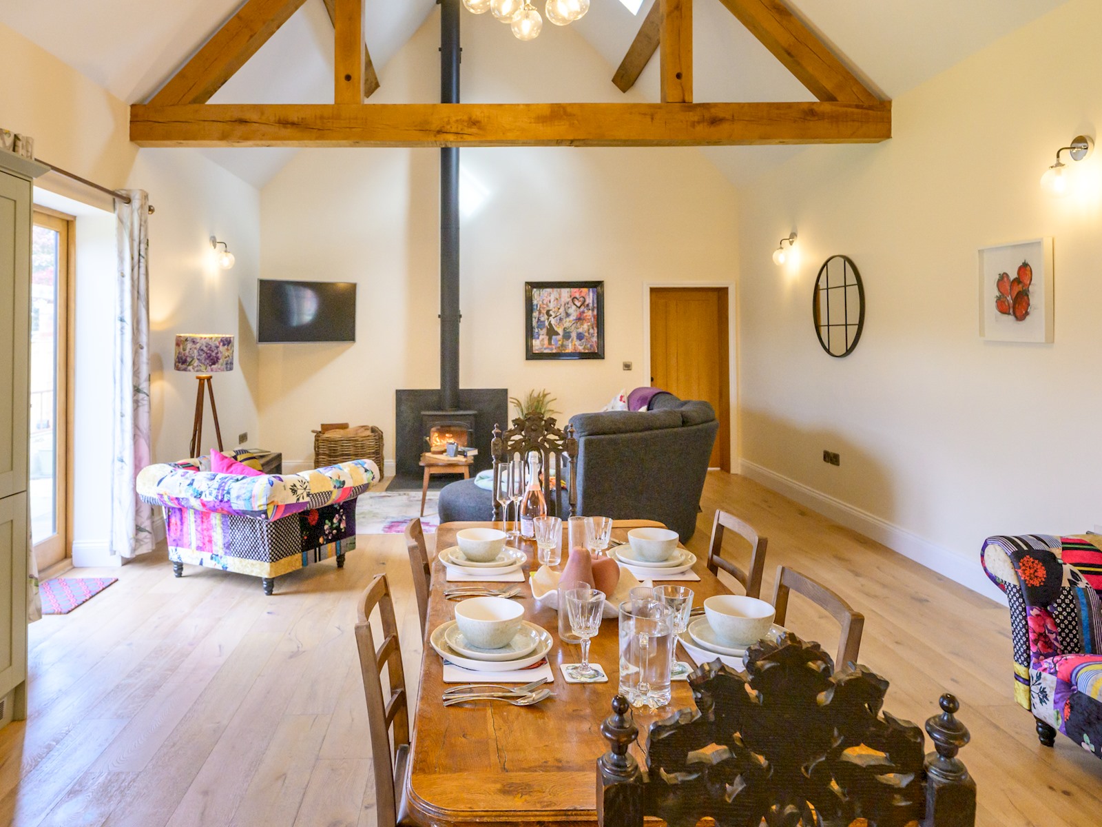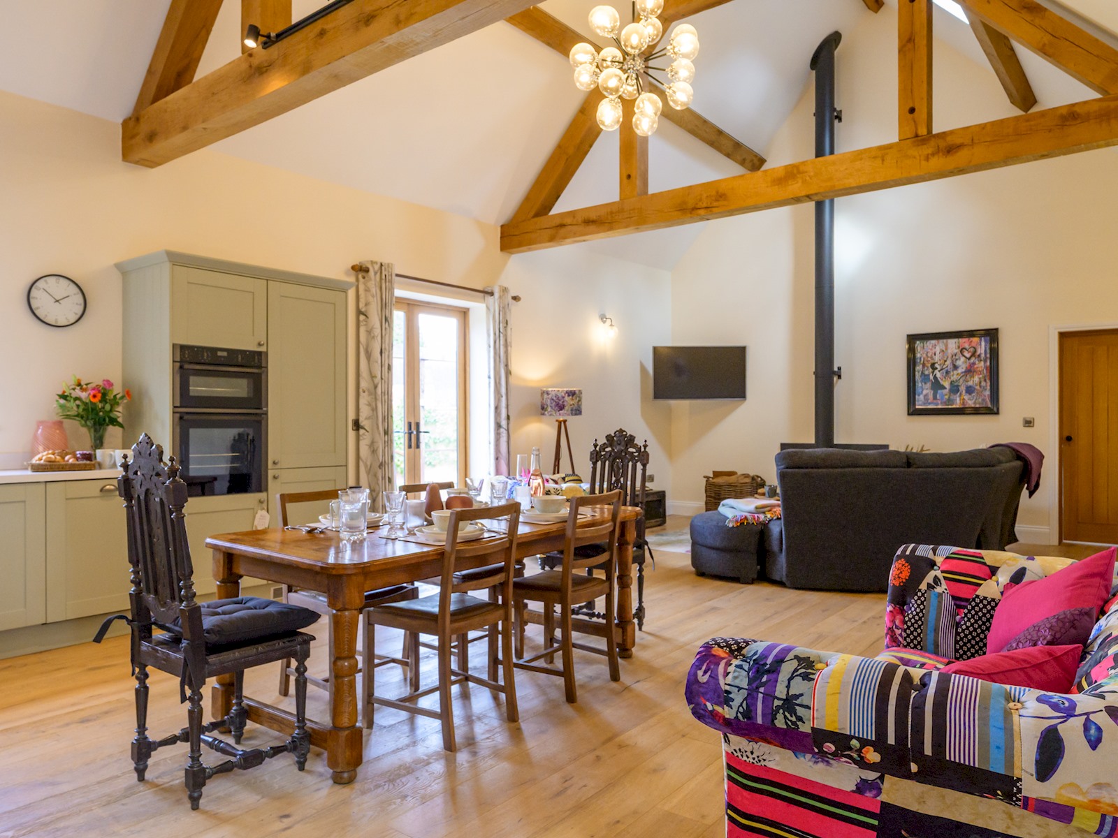 The barn features an open-plan fully equipped kitchen, spacious dining area, and a cosy living room where you can relax after a day exploring the Shropshire hills.