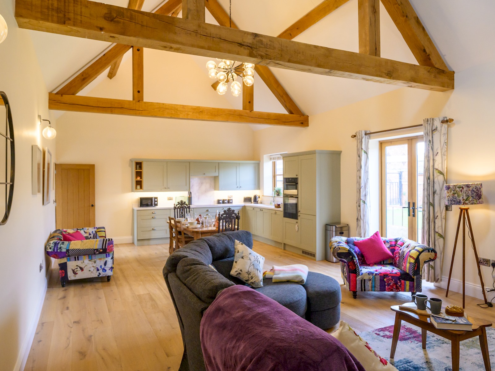 Exposed oak beams with stunning full-height ceilings in the open-plan kitchen / living / dining space.