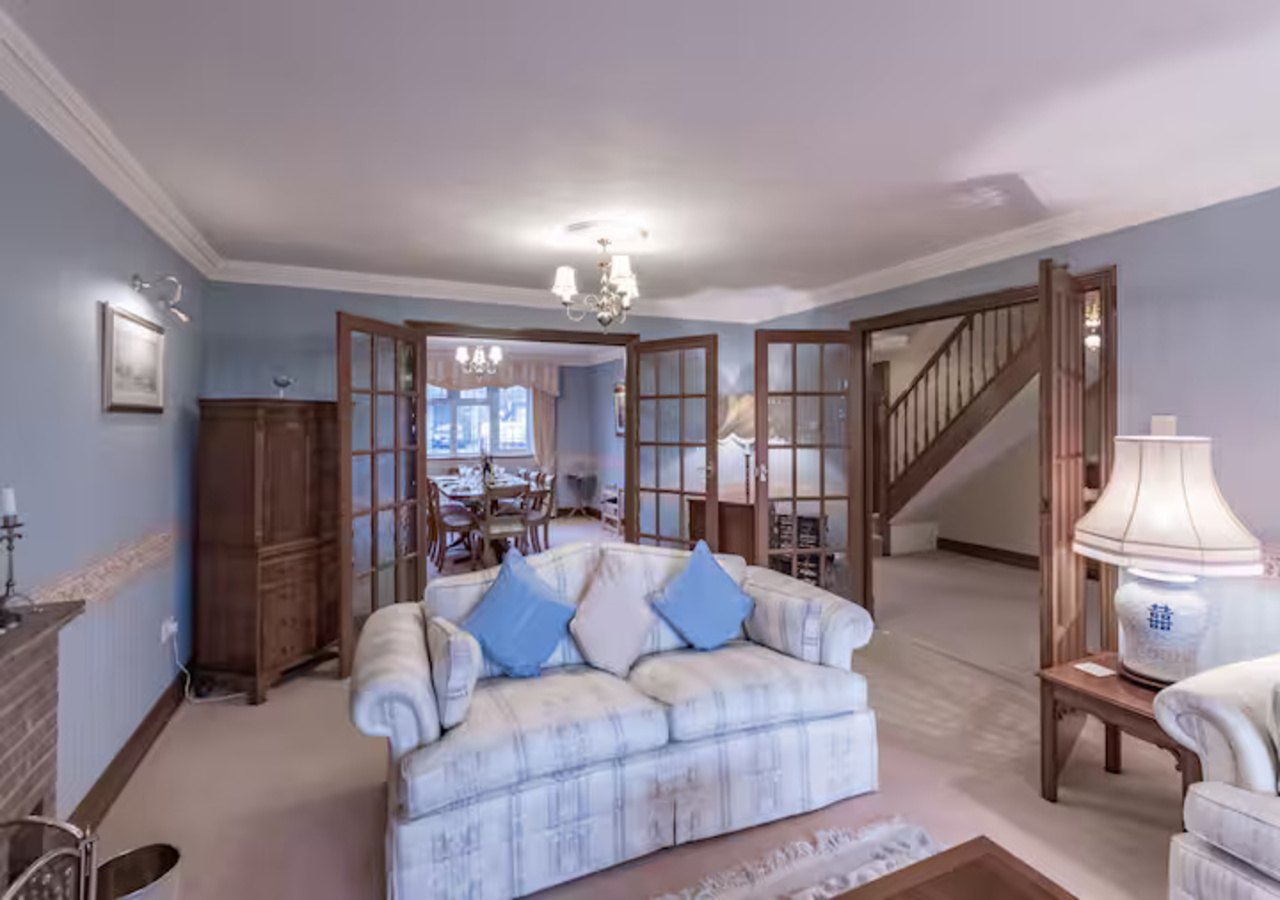 Large living area with comfortable sofas and an armchair, perfect for relaxing or socialising