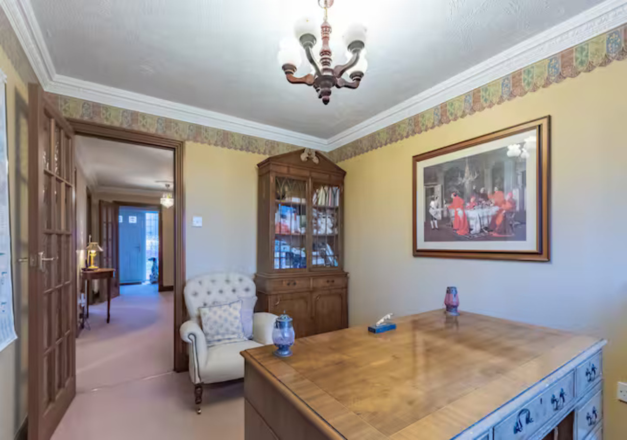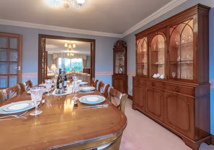 Separate formal dining room, furnished with a substantial wooden dining table and chairs, ideal for family meals or entertaining