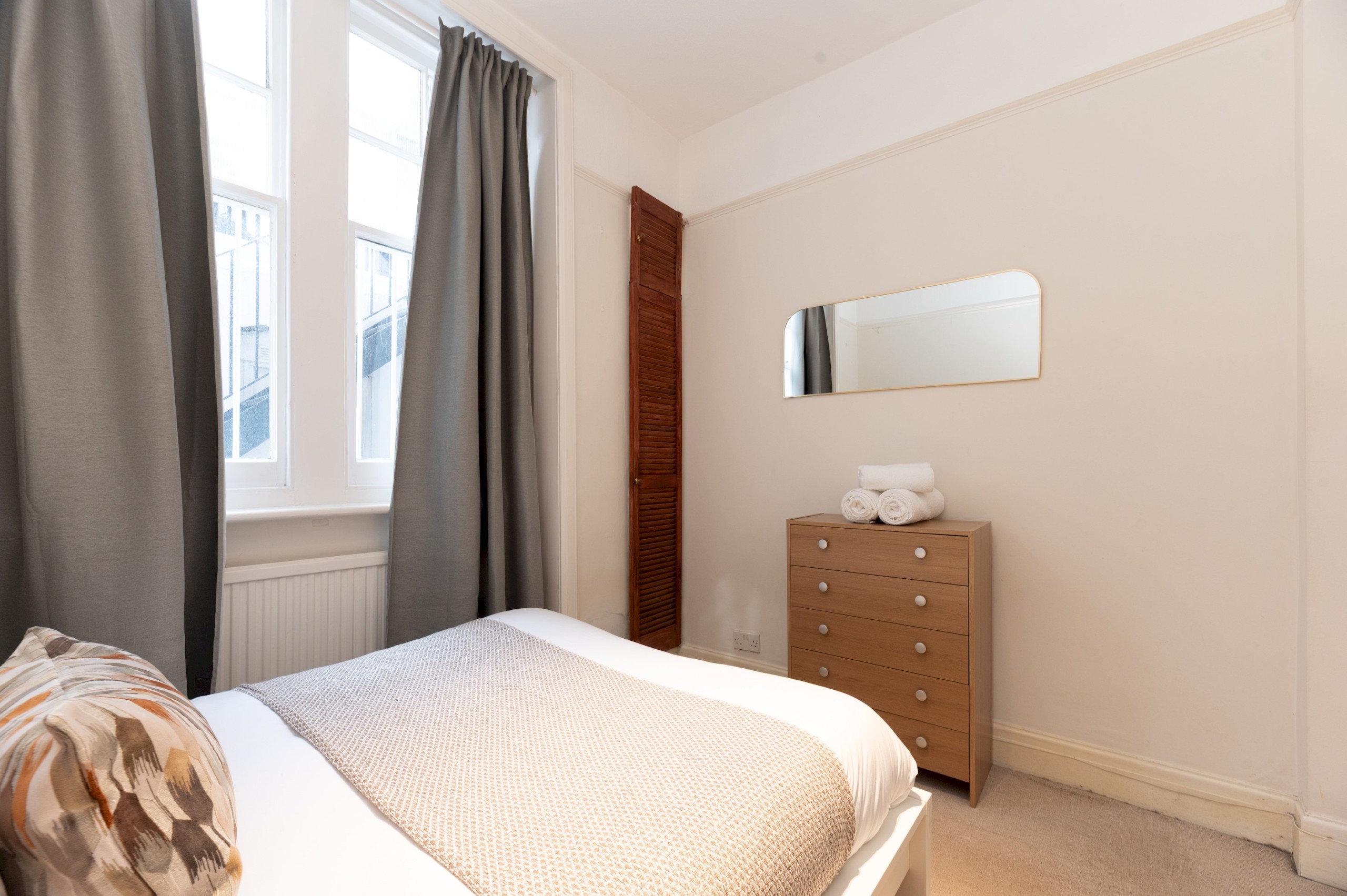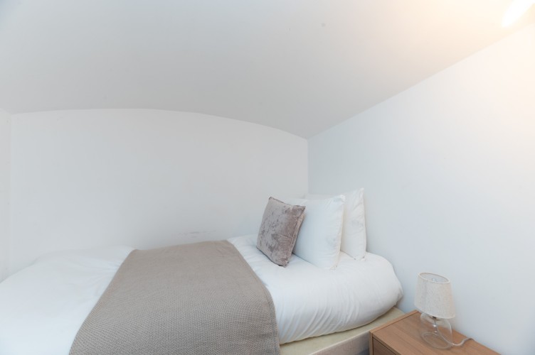 The second bedroom is a compact single room with a standard UK single bed. Due to the room layout, clearance at the head and foot of the bed is limited, and it is best suited to one guest under 6 ft tall.