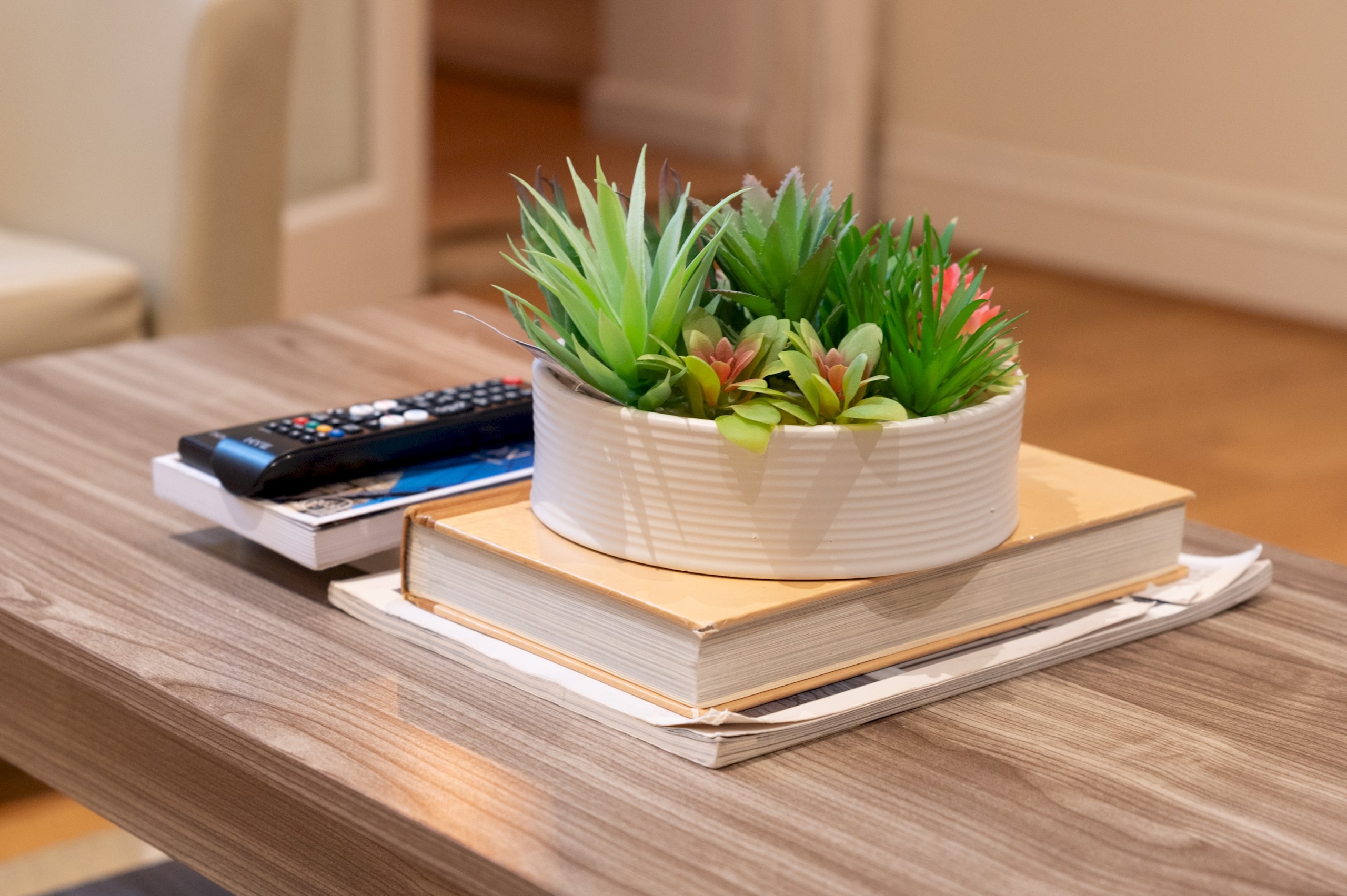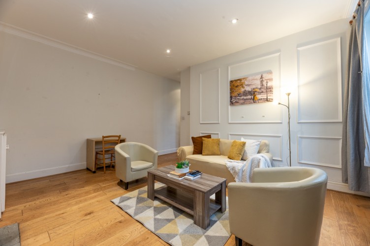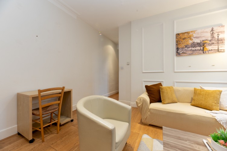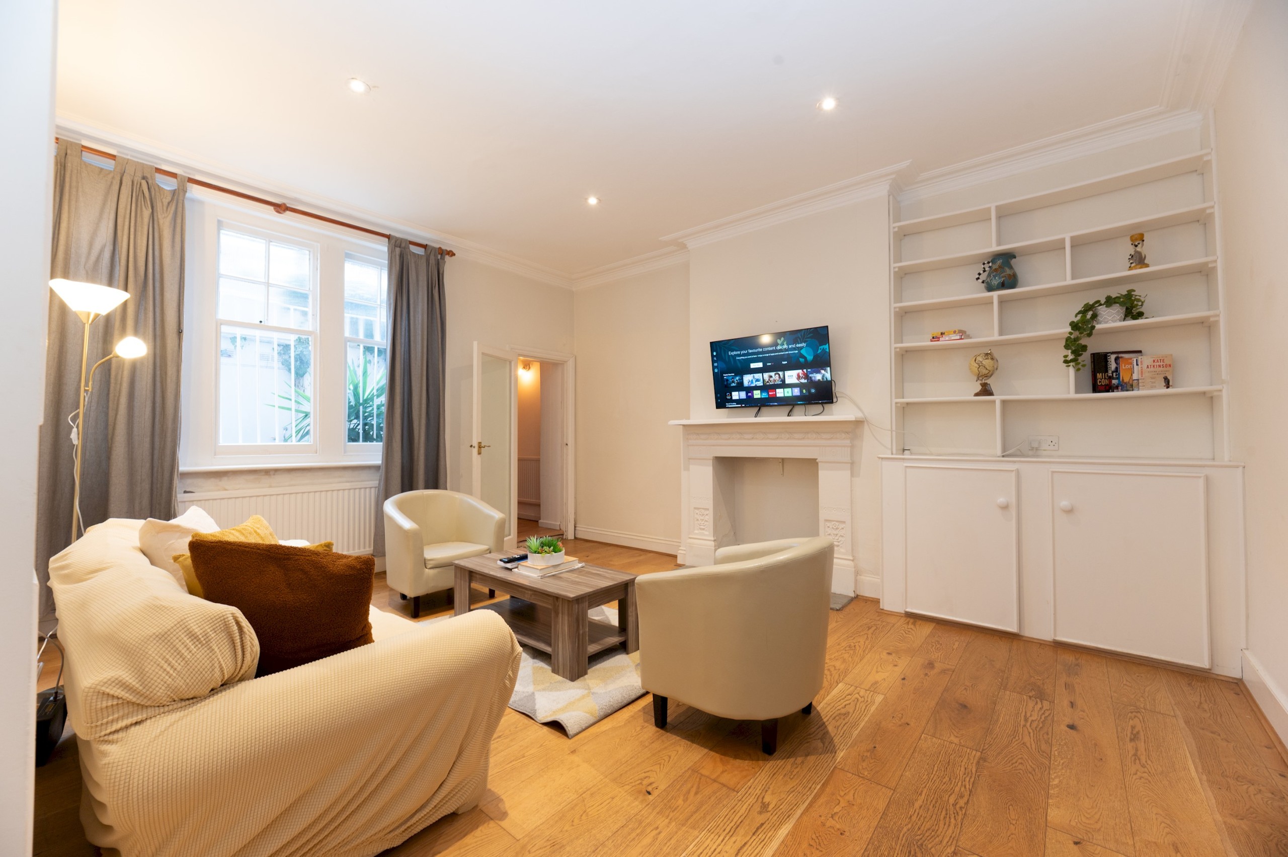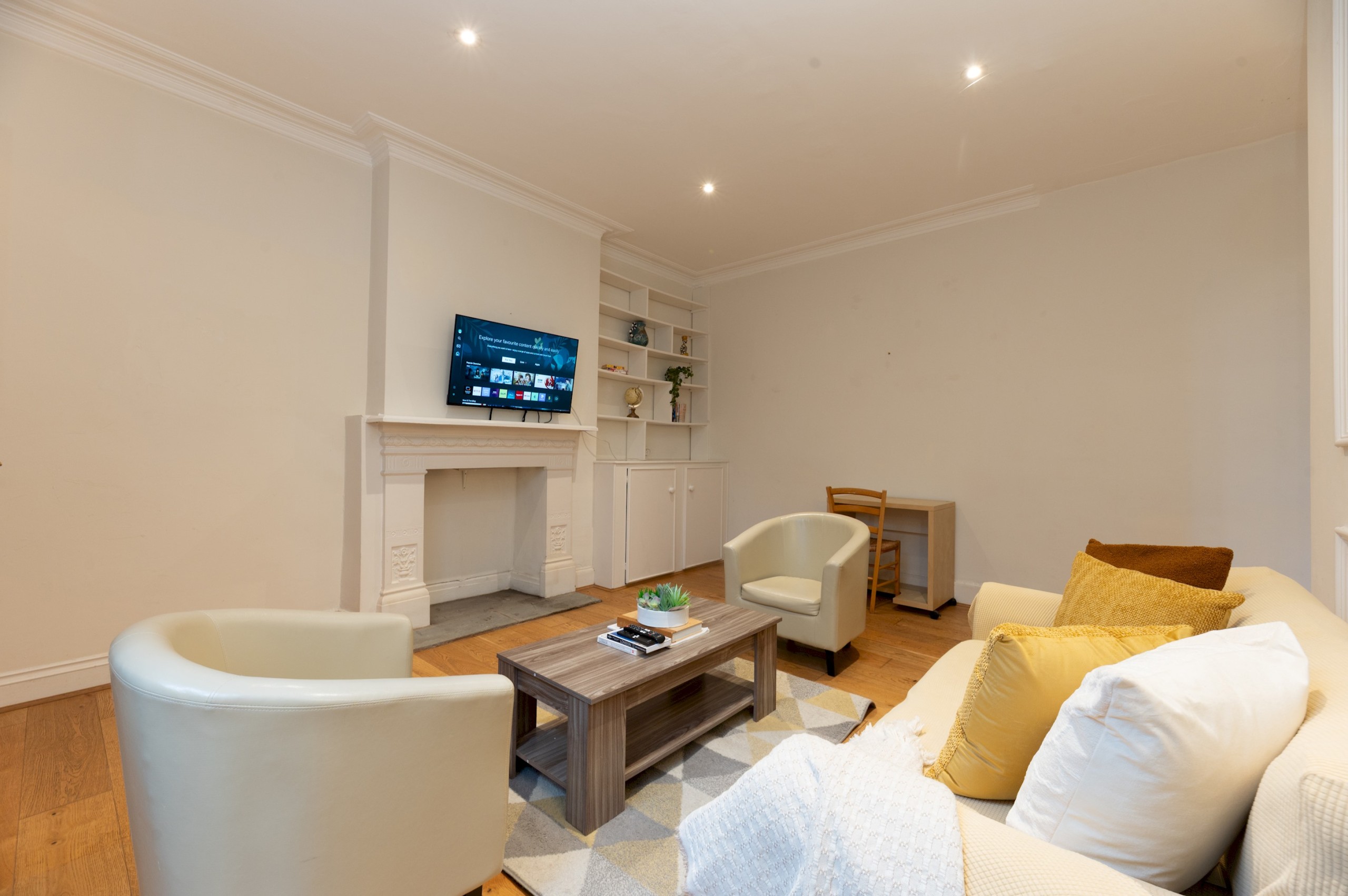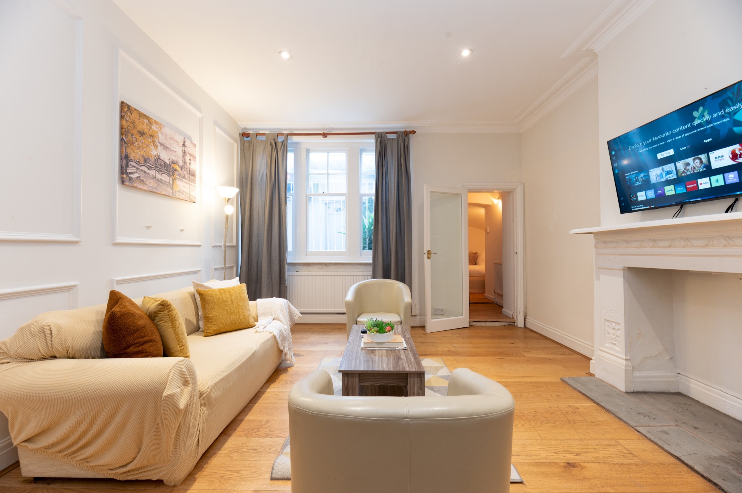 The living room is bright for a basement flat and offers comfortable seating, along with a desk and chair for guests who need a dedicated work desk.