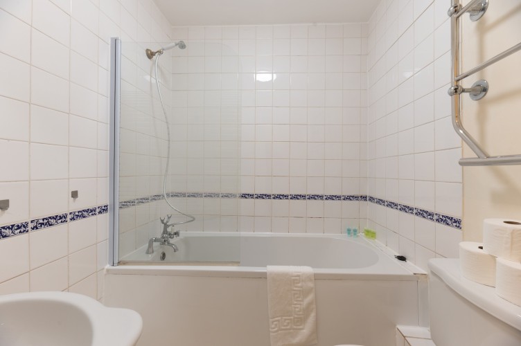 The bathroom is located just beyond the kitchen and is equipped with a bathtub, an overhead shower, a toilet, and a wash basin.
