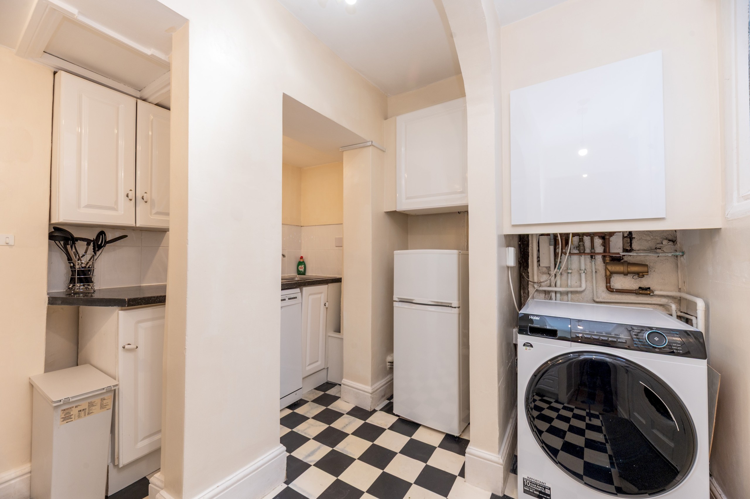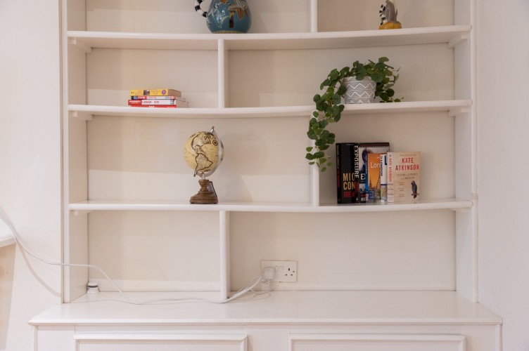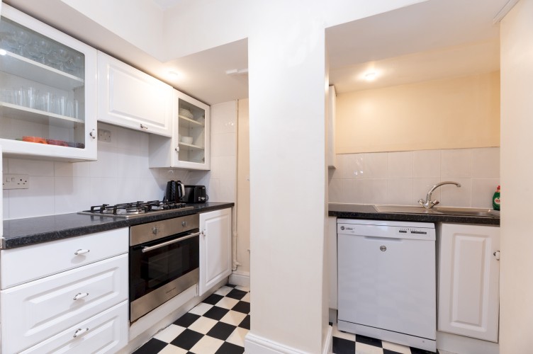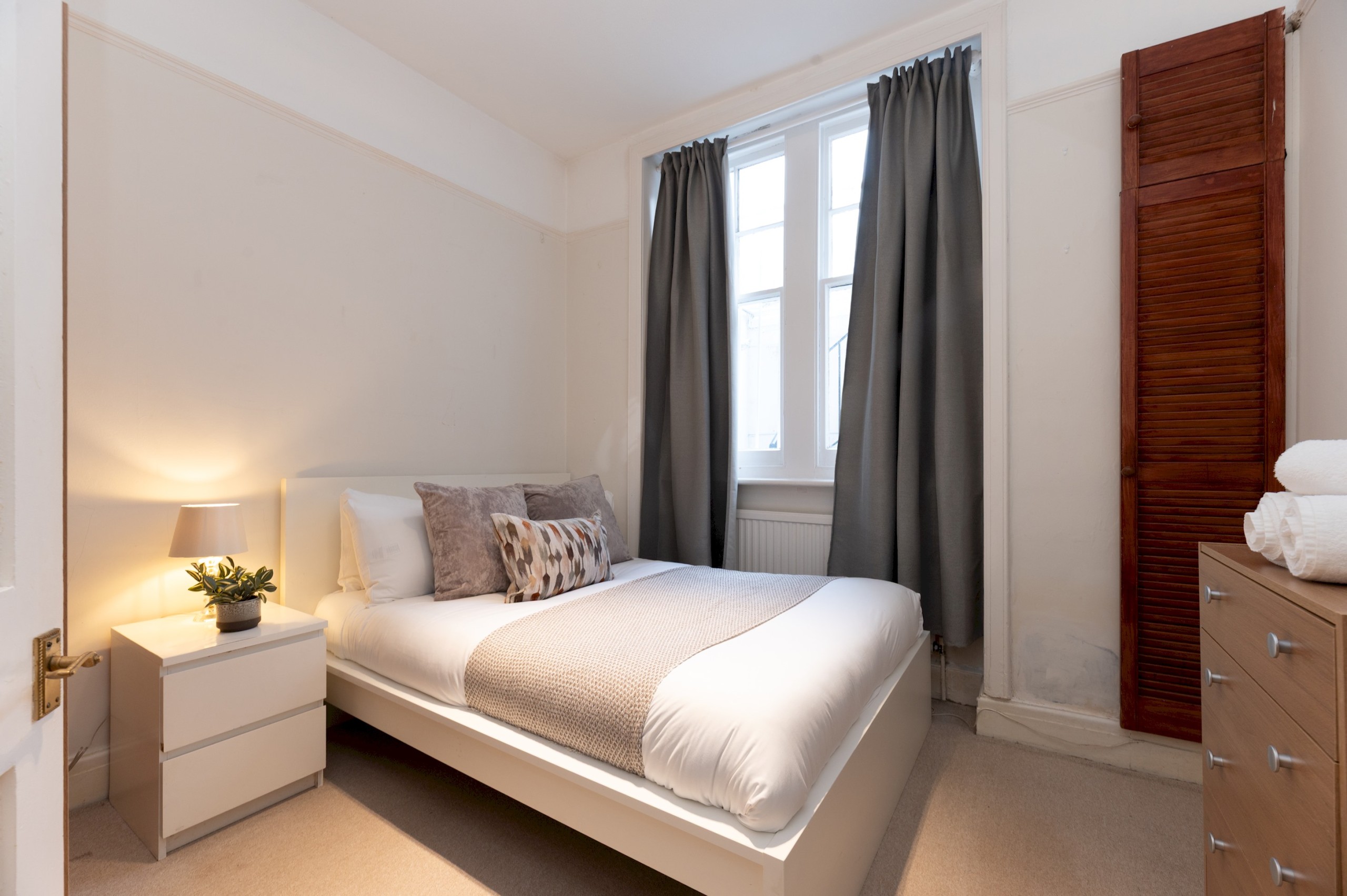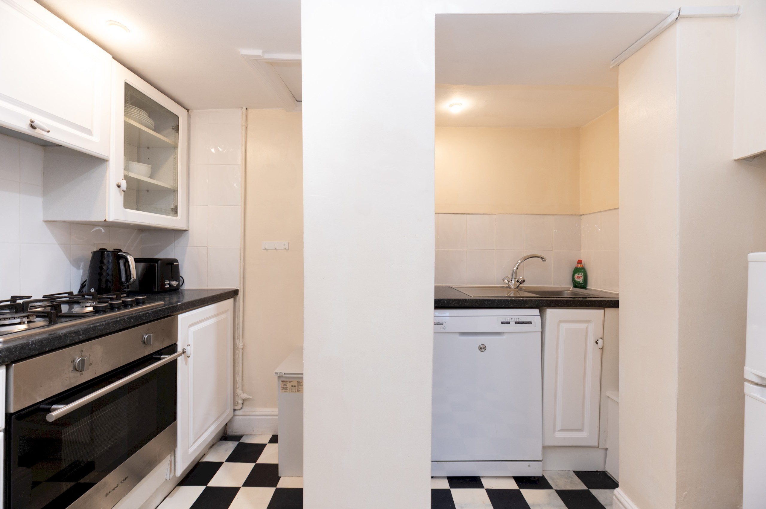 This comfortable two-bedroom basement flat is located in West Kensington, just a 5-minute walk from West Kensington Station. The flat includes a compact, well-equipped kitchen, a bathroom with a bathtub and overhead shower, and a bright living area for a basement flat. The master bedroom has a double bed, while the second bedroom is a single room for one guest. The living room features a two-seater sofa that converts into a double sofa bed, as well as a desk and chair for working.