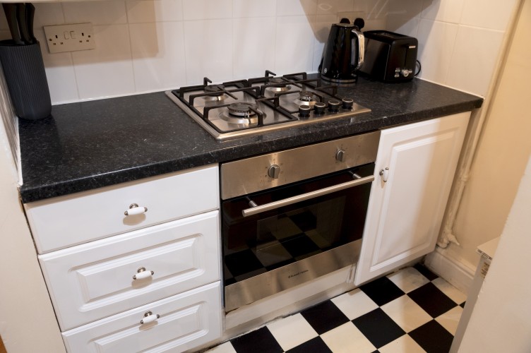 The entrance opens directly into a compact, well-equipped kitchen with everything needed for everyday cooking, making it suitable for both short and longer stays.