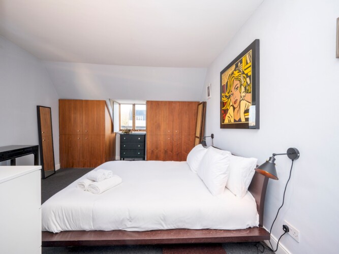 The top floor is home to a tranquil bedroom, featuring a king-size bed with a brand-new Simba mattress. The room includes built-in wardrobes, a chest of drawers, and wall lamps on either side of the bed. A charming circular window adds character to the space. The bathroom is located on this floor in a separate room, offering ambient lighting with lights in the mirror, toilet, hand basin, and a shower over bath, with a handheld shower and a rainfall shower.