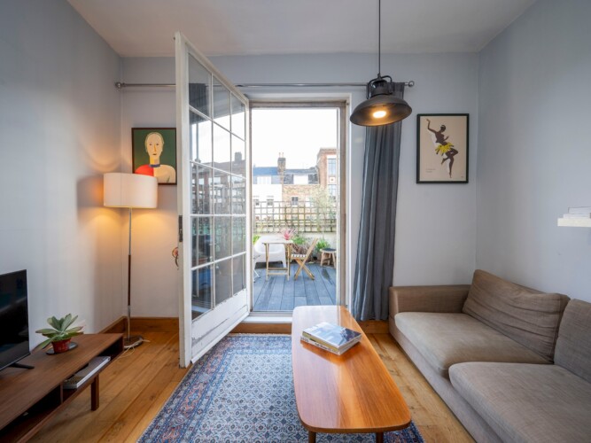 My spacious one-bedroom London retreat is set over three floors and includes a private terrace—excellent for people-watching along Essex Road!