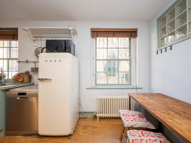 A fully-equipped kitchen diner featuring a breakfast table with two stools, perfect for a slow morning coffee. The kitchen has modern amenities, including a dishwasher, washing machine, clothes dryer, and a stylish cream Smeg fridge freezer. Guests will find a gas hob, oven, microwave, kettle, toaster, and a Dolce Gusto coffee machine (please bring your favourite pods).