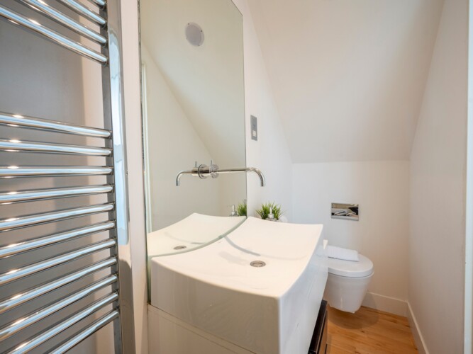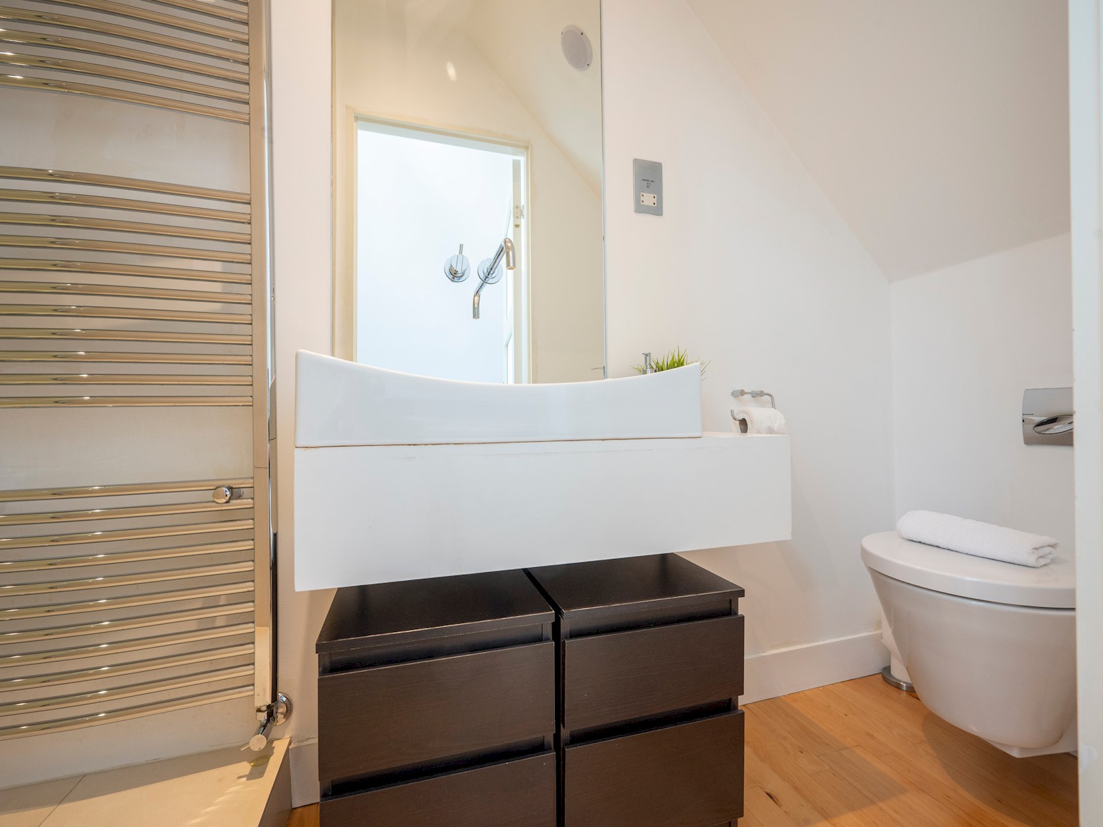 Leading on from the bedroom is a spacious ensuite shower room with shower cubicle, WC, basin, over basin mirror and towel rail. There are some under sink drawers for guest belongings.