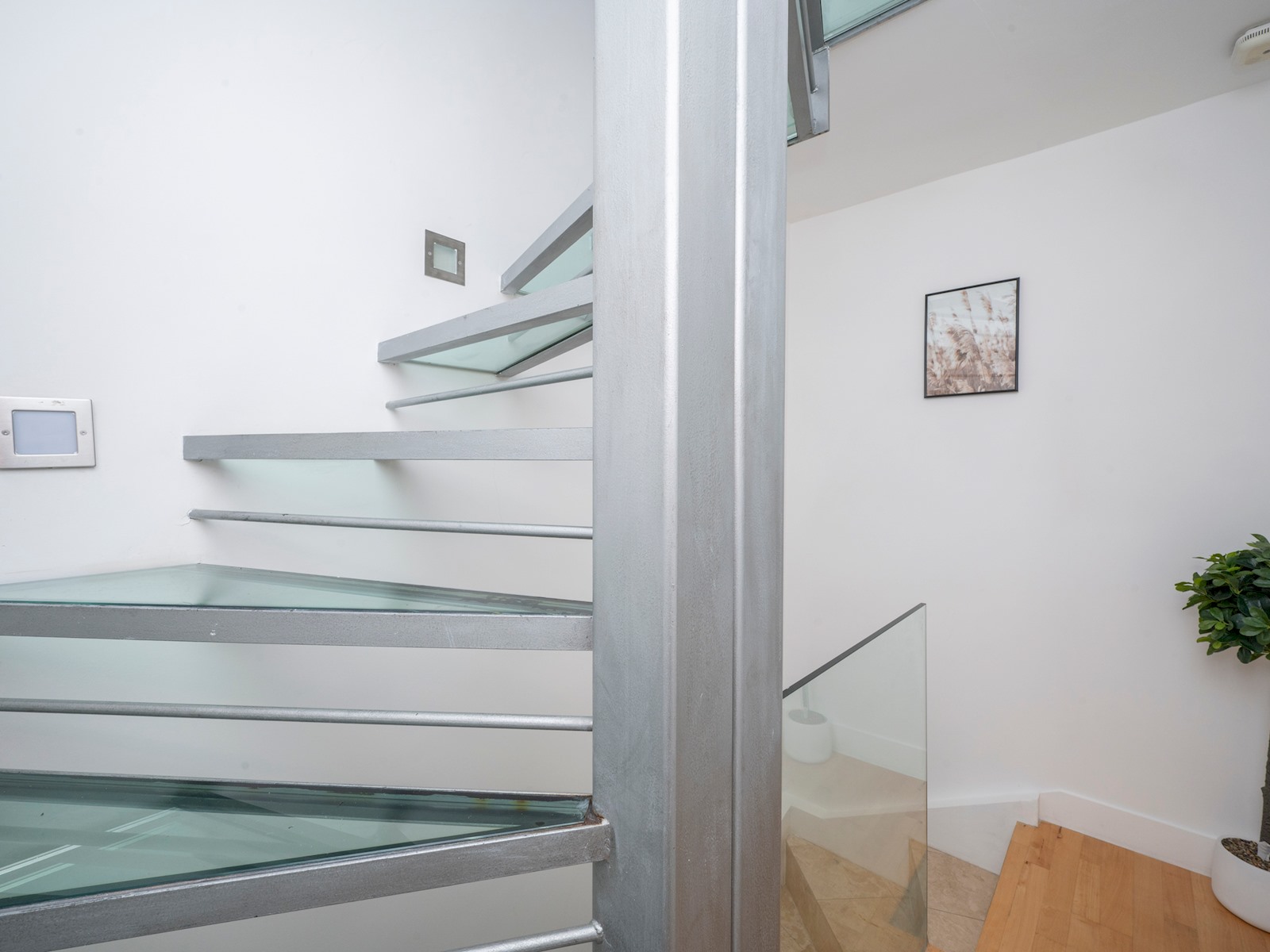There are two steep bespoke flights of stairs within the house, one stone staircase and the other glass staircase. There is no banister available however the wall can be used for support, if required,