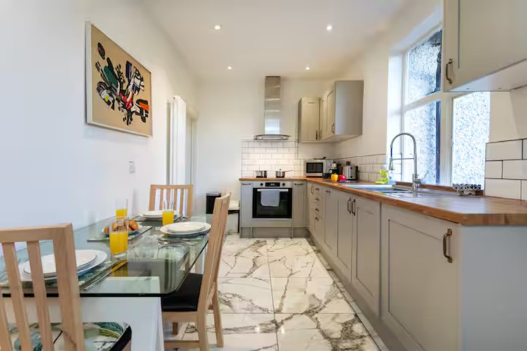 The kitchen comes fully prepared with utensils, an electric hob, oven, microwave, toaster, kettle, fridge-freezer, dishwasher, and a washer-dryer—ideal for self-catering and extended stays. A TV is provided in the living area, along with a laptop-friendly workspace, making the home suitable for remote working or study.